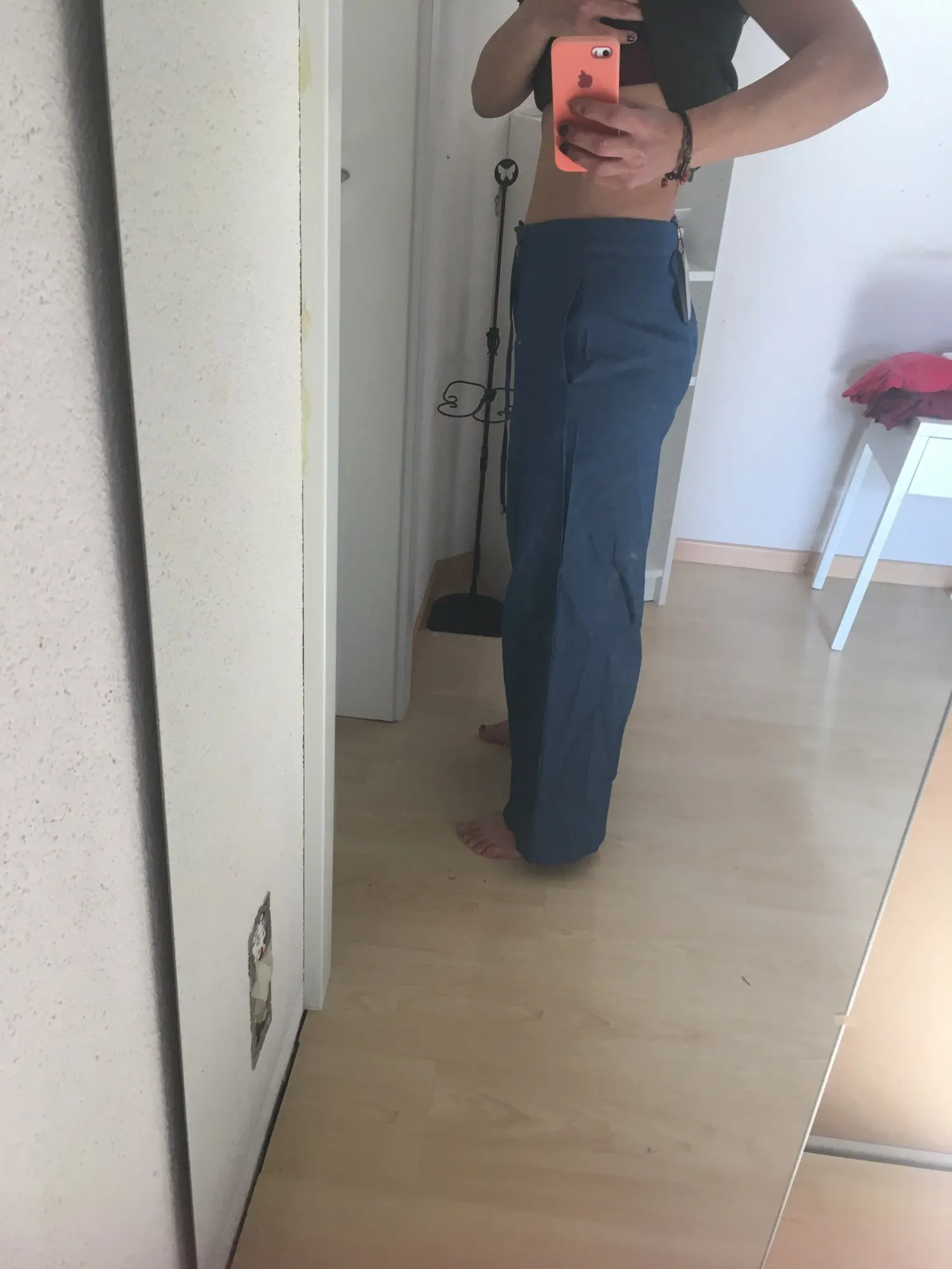 mam 164 cm. Długość odpowiednia do butów bez obcasów. Brak gumki w pasie - sugerujcie się swoimi wymiarami bo się nic nie naciągnie. Mogłam wziąć większy rozmiar dla efektu ze zdjęcia, ale te też prezentują się dobrze - noszę wyżej.