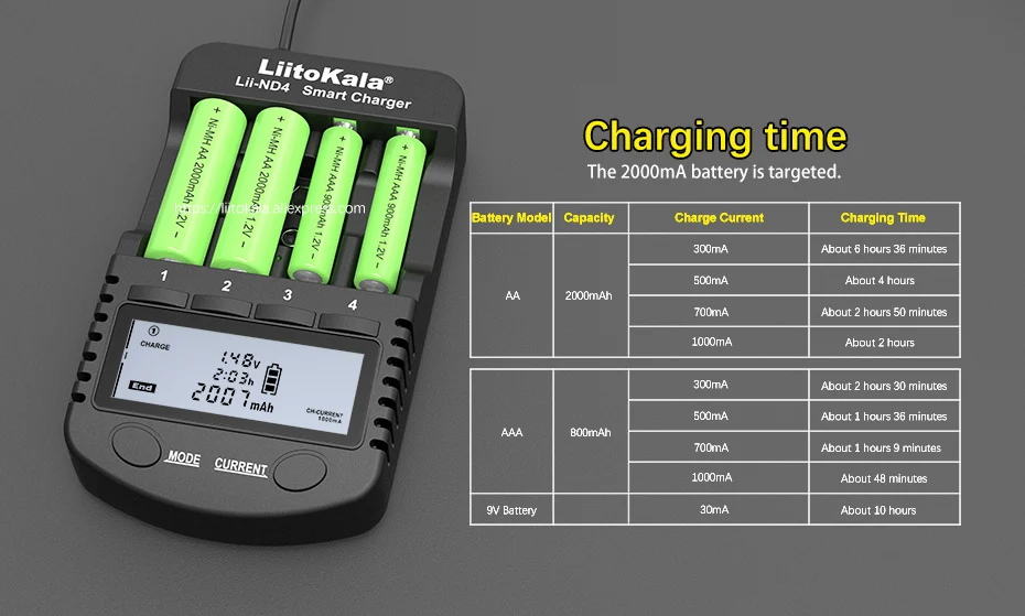 Бренд: LiitoKalaМодель: Lii-ND4Вход: DC 12V/1.5AВыход: постоянный ток 1,48 в (300 мА \ 500 мА \ 700 мА \ 1000 мА) / 9 В (30 мА)Выход USB: 5 В/1 АПодходящие Аккумуляторы: NiMH/Cd AA, AAA, 9 В, аккумулятор.