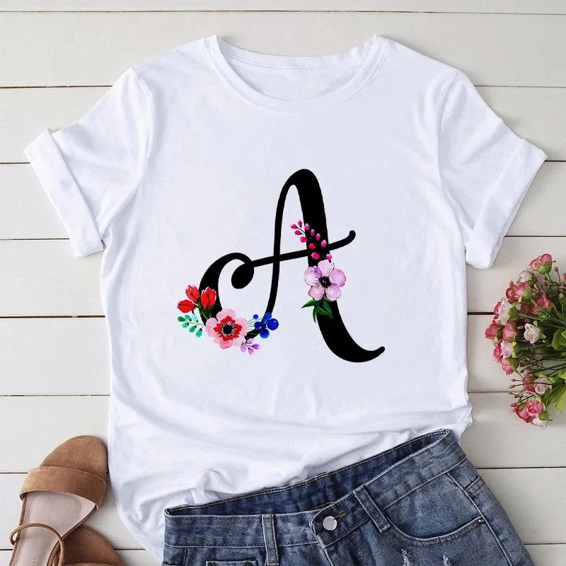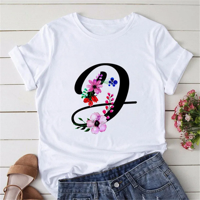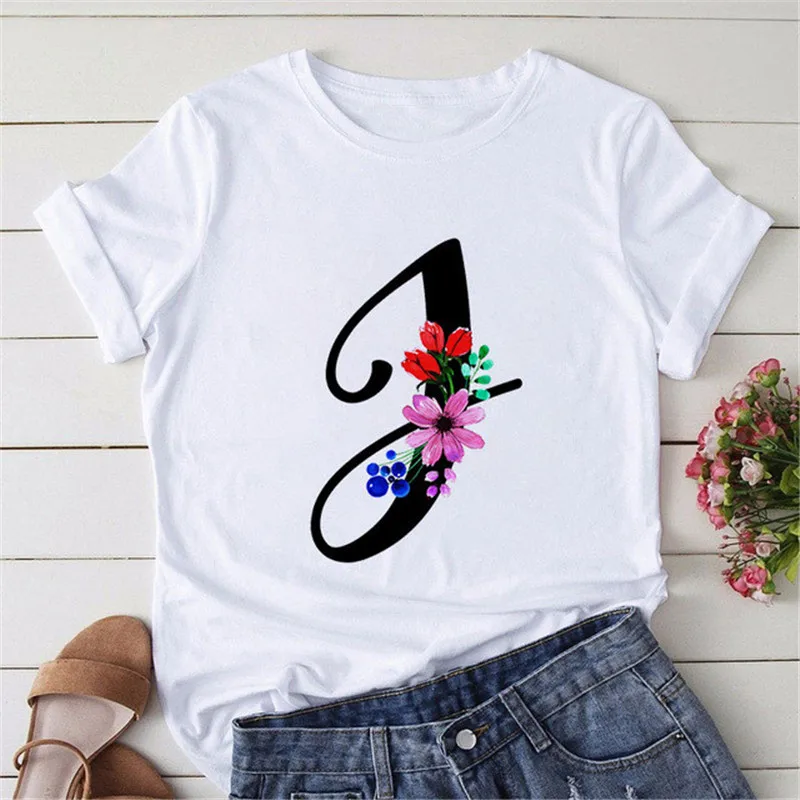 Женская футболка с буквами алфавита, 26 цветов, с коротким рукавом