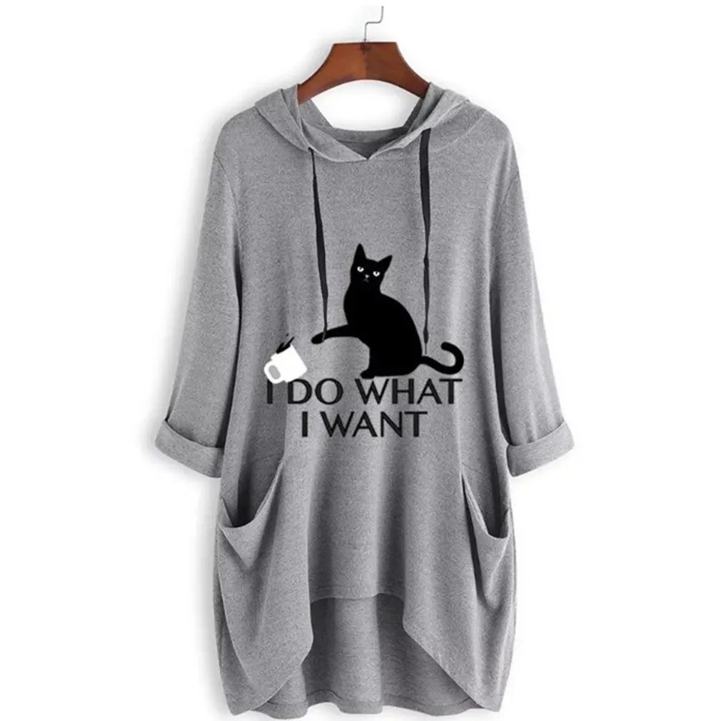 2. Особенности: длинный рукав, надпись «I Do What I Want» и рисунок с котом, асимметричный подол, повседневный стиль, топы-туники с графическим рисунком и манжетами в рубчик и завязками.