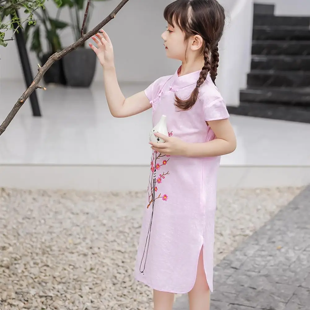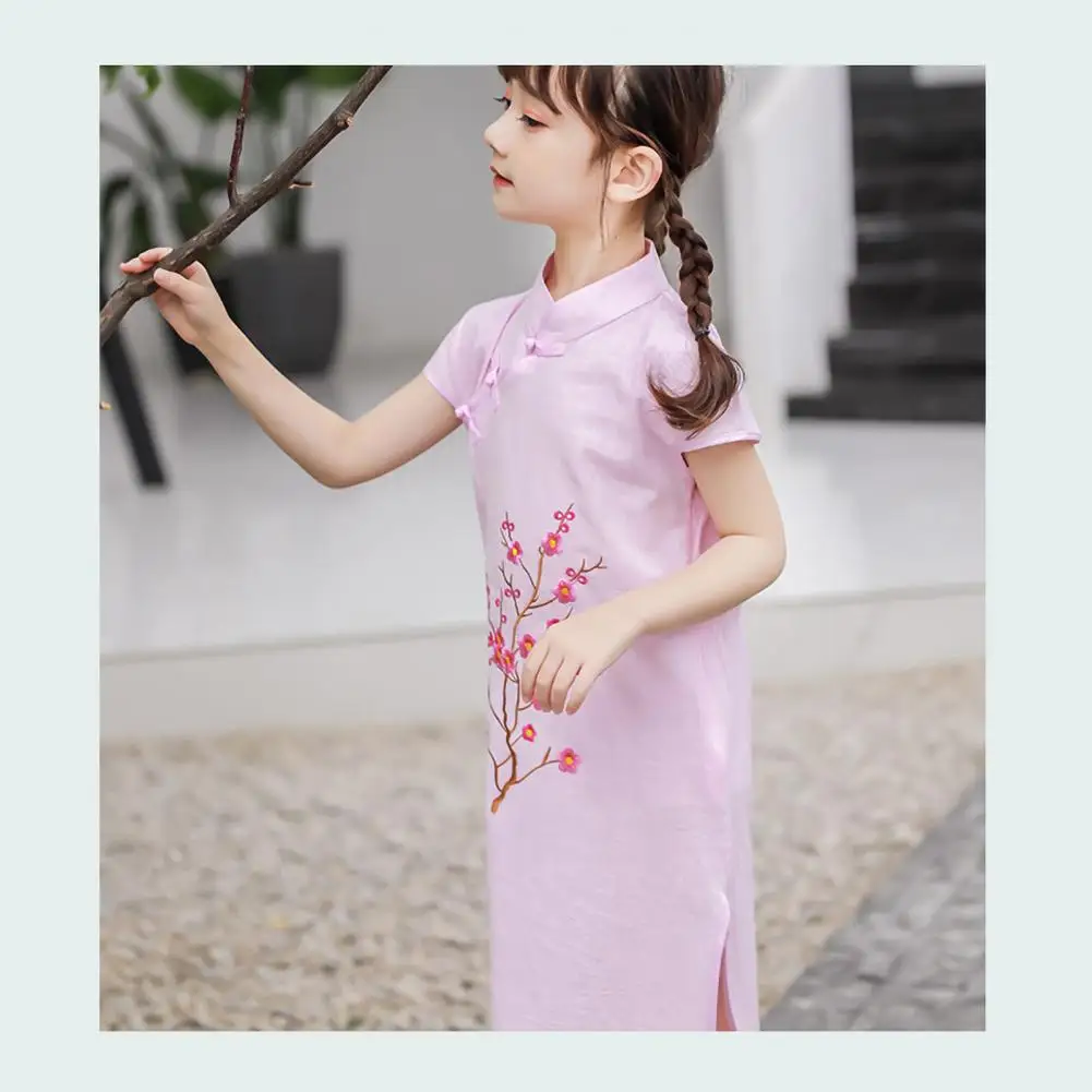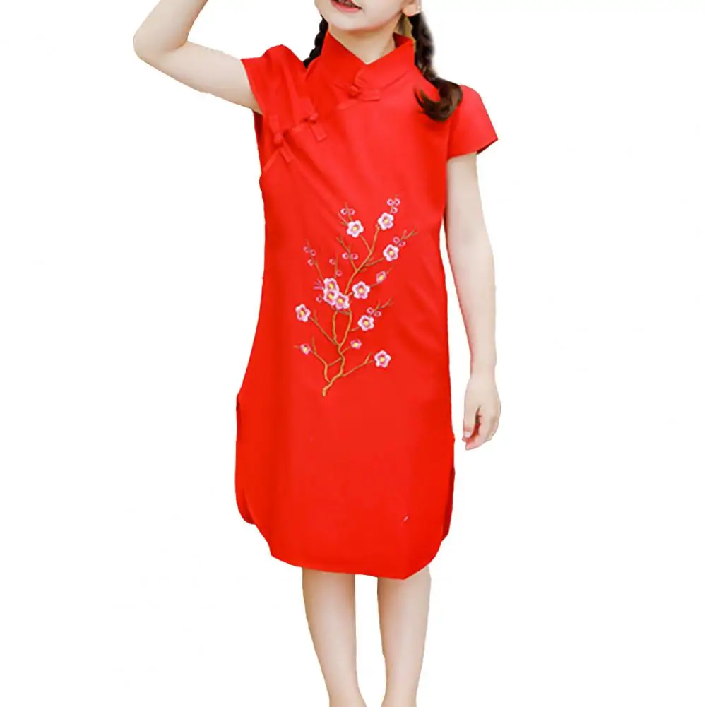 Платье-Ципао с коротким рукавом для девушек, хлопковое платье в китайском стиле с вышивкой для нового года, Хлопковое платье в китайском стиле