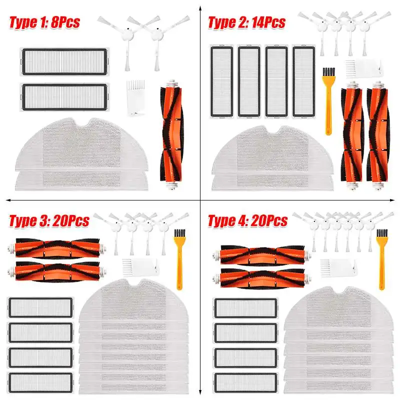 Посылка входит:Тип 1: 20 шт./компл.2 x роликовая щетка4 x HEPA-фильтр4 боковых щетки8 шт. тряпка для швабры1 x Чистящая Щетка1 расческаТип 2: 14 шт./компл.2 x роликовая щетка4 x HEPA-фильтр4 боковых щетки2 шт. тряпка для швабры1 x Чистящая Щетка1 расческаТип 3: 8 шт./компл.1 роликовая щетка2 x HEPA-фильтра2 боковых щетки2 шт. тряпка для швабры1 расческаСовместимость моделей:Для xiaomi 1c / STYTJ01ZHMОсобенности:1. Чистые щетки поддерживают работоспособность вашего домашнего робота.2. Боковые щетки легко снимаются и заменяются в рамках обычного ухода.3. Фильтры поддерживают эффективность уборки робота при этом уменьшают попадание пыли, пыльцы и других аллергенов в воздух, которым вы дышите.4. Для достижения наилучших результатов фильтры следует заменять каждые 2-3 месяца.5. Только для использования с роботом Xiaomi MI 1c/STYTJ01ZHM.6. Комплектующие для пылесоса отличаются высоким качеством. Изготовлен из высокопрочных и экологически чистых материалов.7. Аксессуары легко удаляют грязь, пыль и мусор в углах и краях эффективно. Особенно ваши волосы и шерсть вашего питомца.8. Детали аксессуаров долговечны и просты в установке, делают ваш Роботизированный пылесос дольше.Примечание.1. Замеры сделаны вручную, поэтому возможны отклонения на 1-2 см.2. Пожалуйста, поймите, что цвета могут отличаться от отображаемых на дисплее.