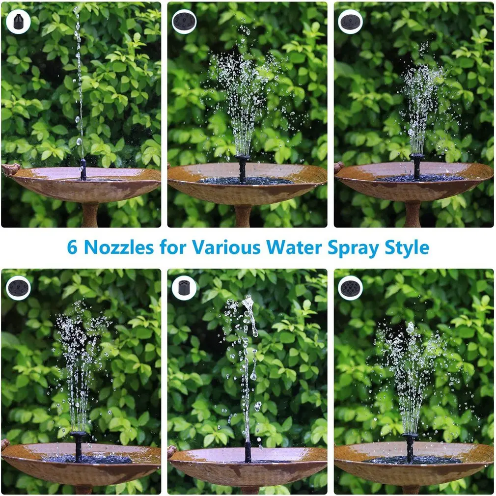 1. Производительность: подключение различных сопла, высота распыления воды будет отличаться. Когда солнечная панель получает достаточное количество солнечного света, водяной насос начнет работать в течение 3 секунд.