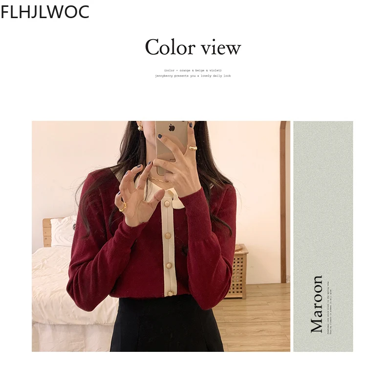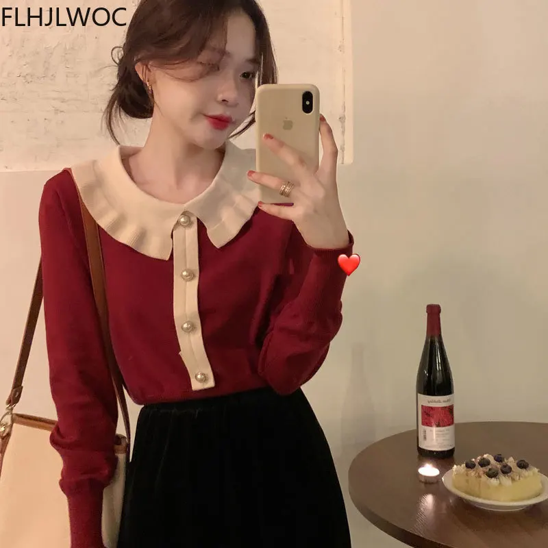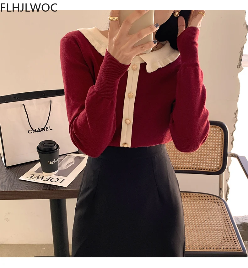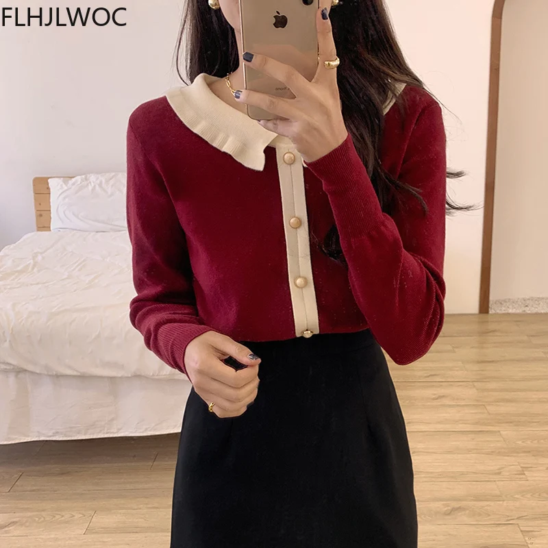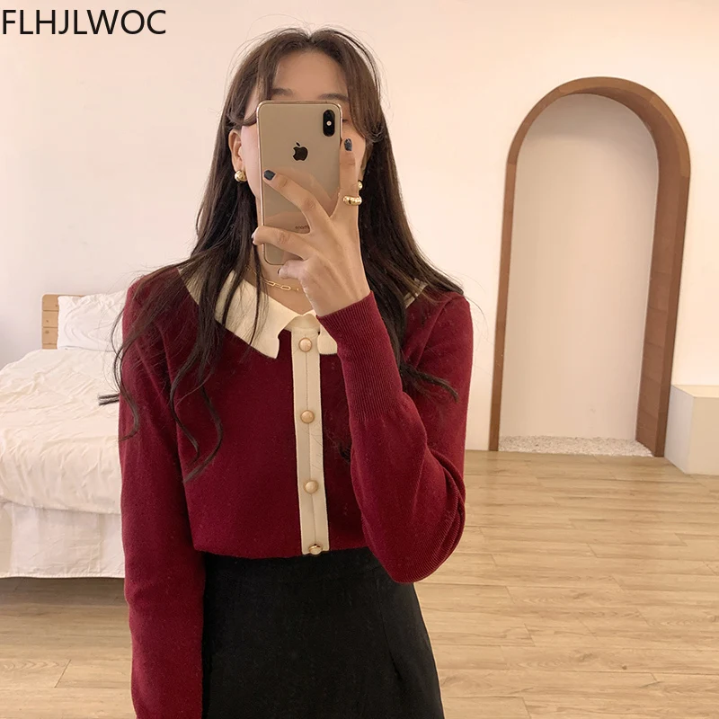Лидер продаж милые сладкие Топы для женщин с длинным рукавом; Повседневная одежда в стиле пэчворк; Однобортный свитер, Стильный вязаный свитер красного цвета с короткими свитер