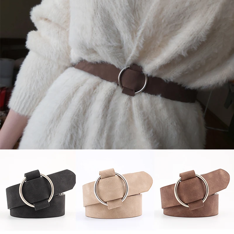 Модные безиголочная металлический ремень с круглой пряжкой Досуг кожаным ремнем все-матч Женская Дикий джинсовое платье с поясом