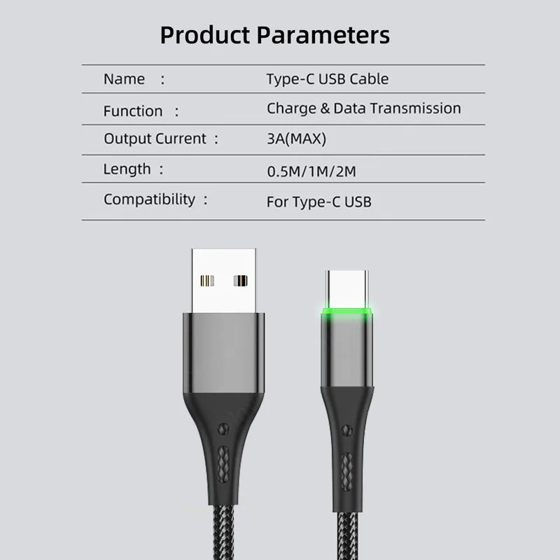 0,5 м/1 м/2 м/3 м Светодиодные 3A кабель с разъемом USB Type-C для быстрой подзарядки для Samsung Galaxy Xiaomi 6 Note 7 данных USB-C кабель быстрой зарядки