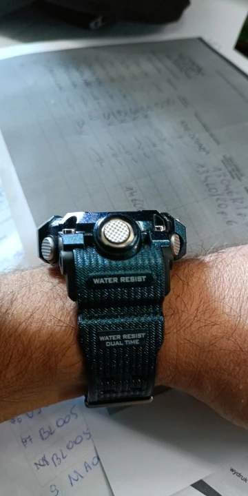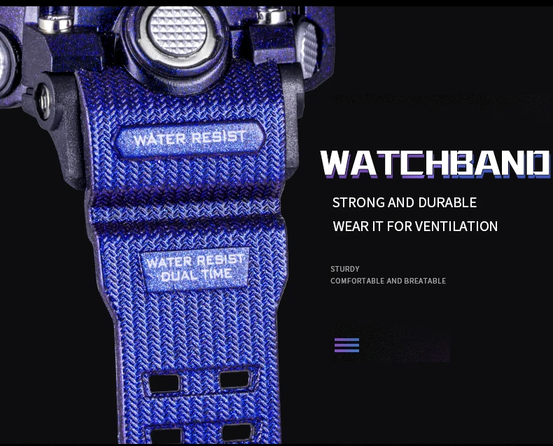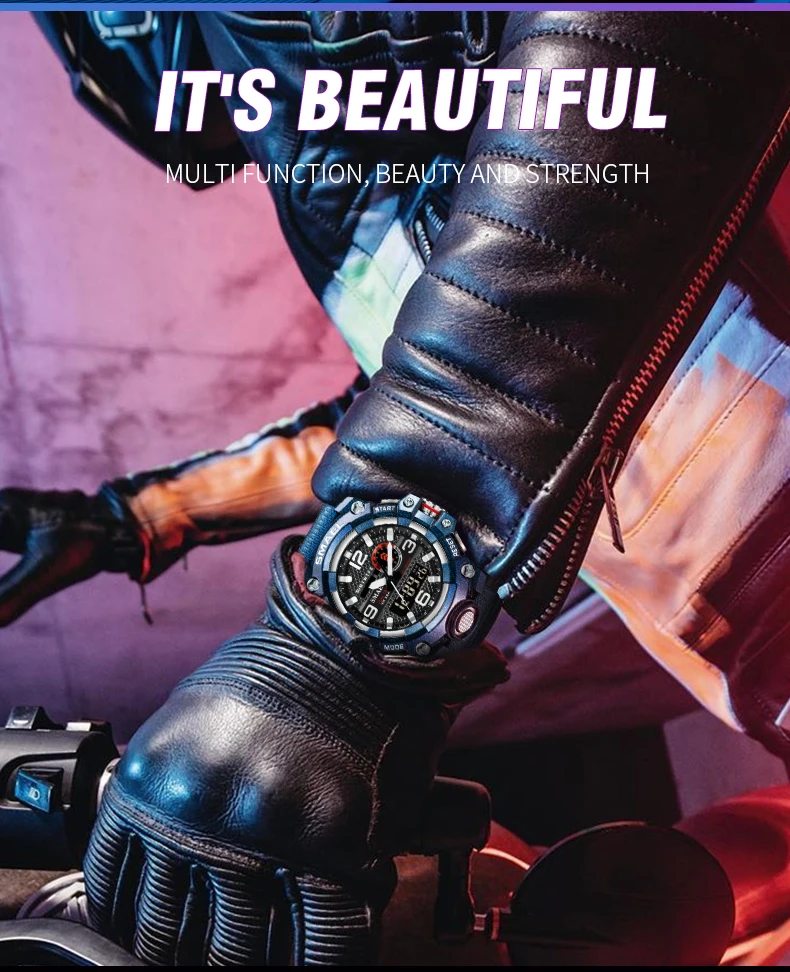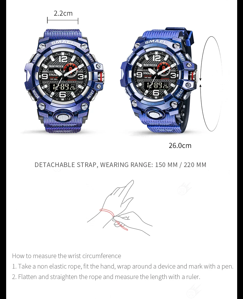 -Регулируемый резиновый ремешок 22 мм, подходит для окружности запястья до 22 см-Дневные будильники; Три часовых пояса; Военный режим времени; Календарь недели, даты и месяца; Хронограф; Секундомер-52 мм резиновый корпус с 3 циферблатом; Акриловые линзы; Светящийся дисплей часов; Черный отрицательный цифровой дисплей-Водонепроницаемость до 5 атм-50 метров-165 футов: в общем, подходит для короткого периода рекреационного плавания, но не ныряния и подводного плавания (не нажимайте кнопки под водой)