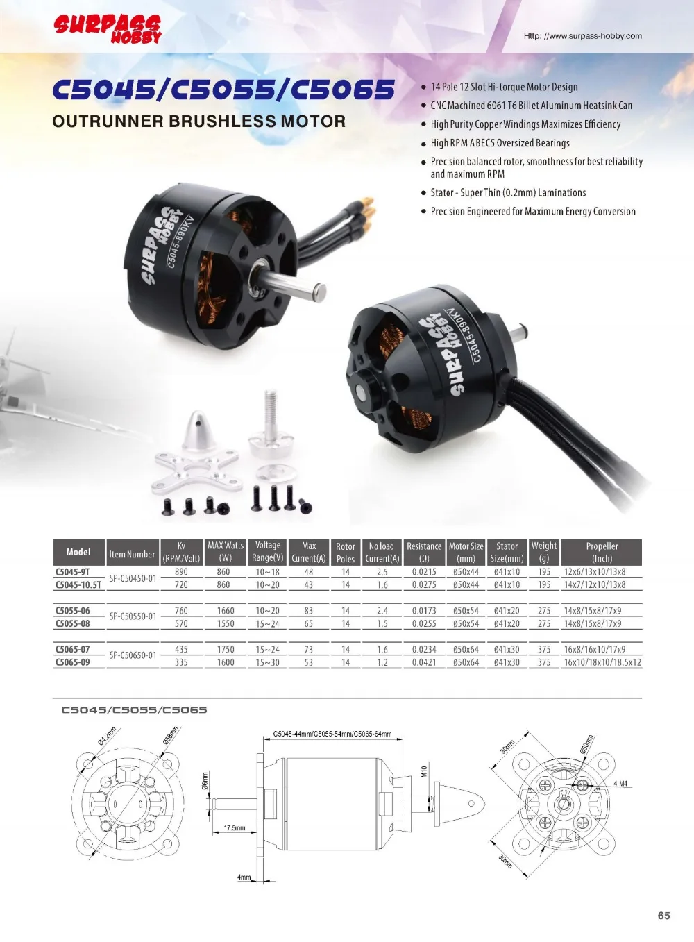 Бесщеточный двигатель SURPASS HOBBY C5065 5065 435KV 335KV для само...