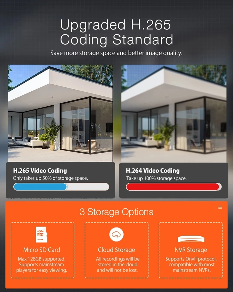 Усовершенствованная технология кодирования видео H.265, видео можно просматривать более плавно и экономить 50% пространства памяти при тех же условиях сети (против H.264)