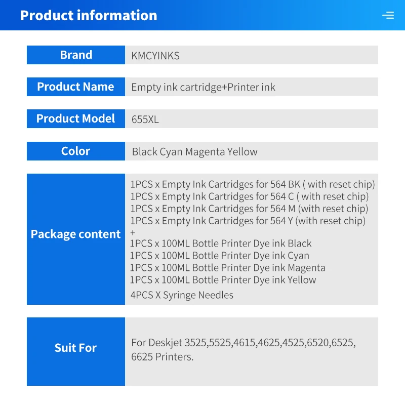 Сменные картриджи KMCYinks для HP 655, многоразовые чернильные картриджи с постоянным чипом для принтера hp Deskjet 3525 4615 4625 5525 6525