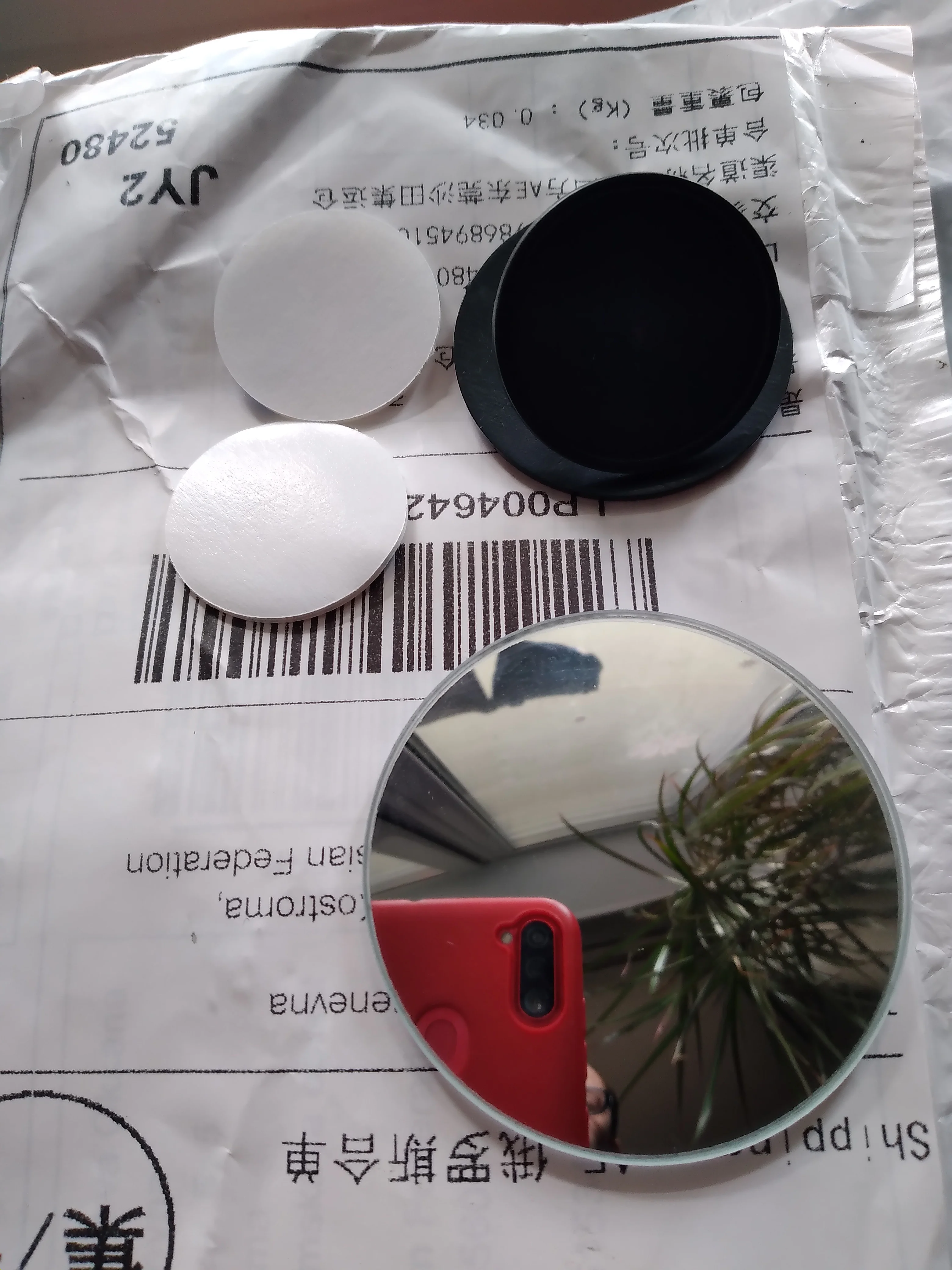 сначала показалось, что зеркало пластиковое. но попытался поцарапать лезвием торец - не получилось. так что похоже и правда стекло. скотч наклеен не очень ровно и диаметром чуть меньше диаметра зеркала, в этот зазор может попадать грязь. в остальном вроде нормально.