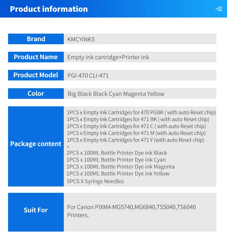 Советы:Пожалуйста, проверьте, является ли ваша оригинальная модель чернильного картриджа PGI 470 CLI 471 XL перед заказом