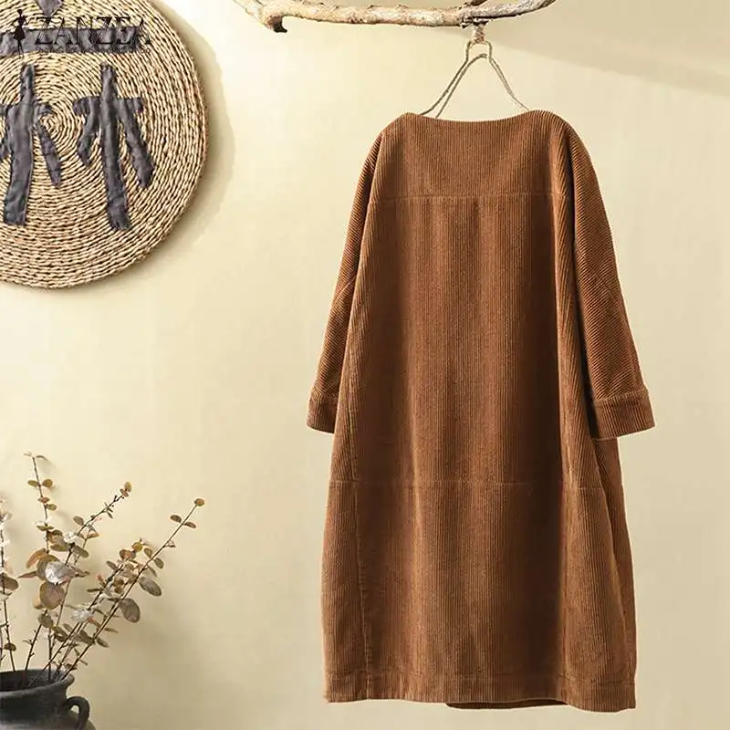 Винтажное вельветовое мини-платье, Женский Осенний сарафан ZANZEA 2021, Повседневная Туника с длинным рукавом, Женские однотонные толстовки, Халат