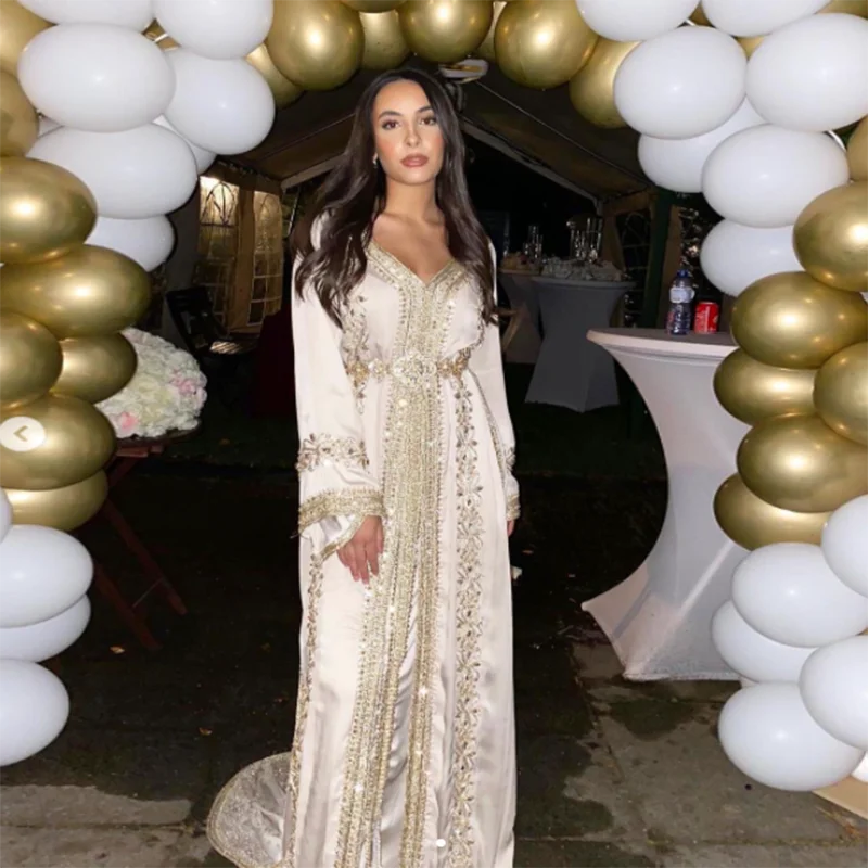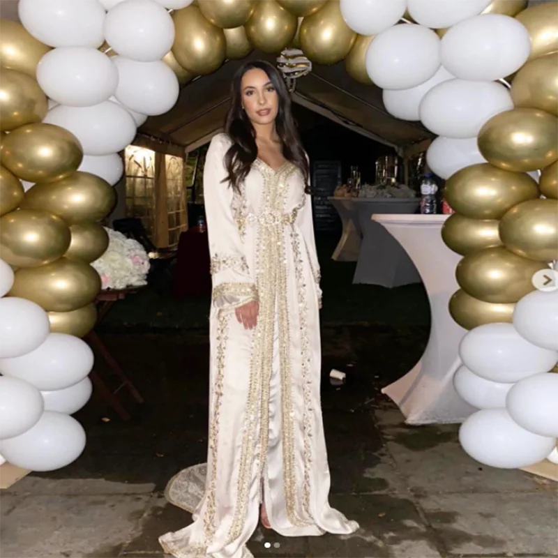 Мода Белый Марокканский Кафтан Вечерние платья с длинным рукавом платье для выпускного вечера с бисером кружево вельветовое платье трапециевидного силуэта De Soiree Выходные туфли на выпускной 2021