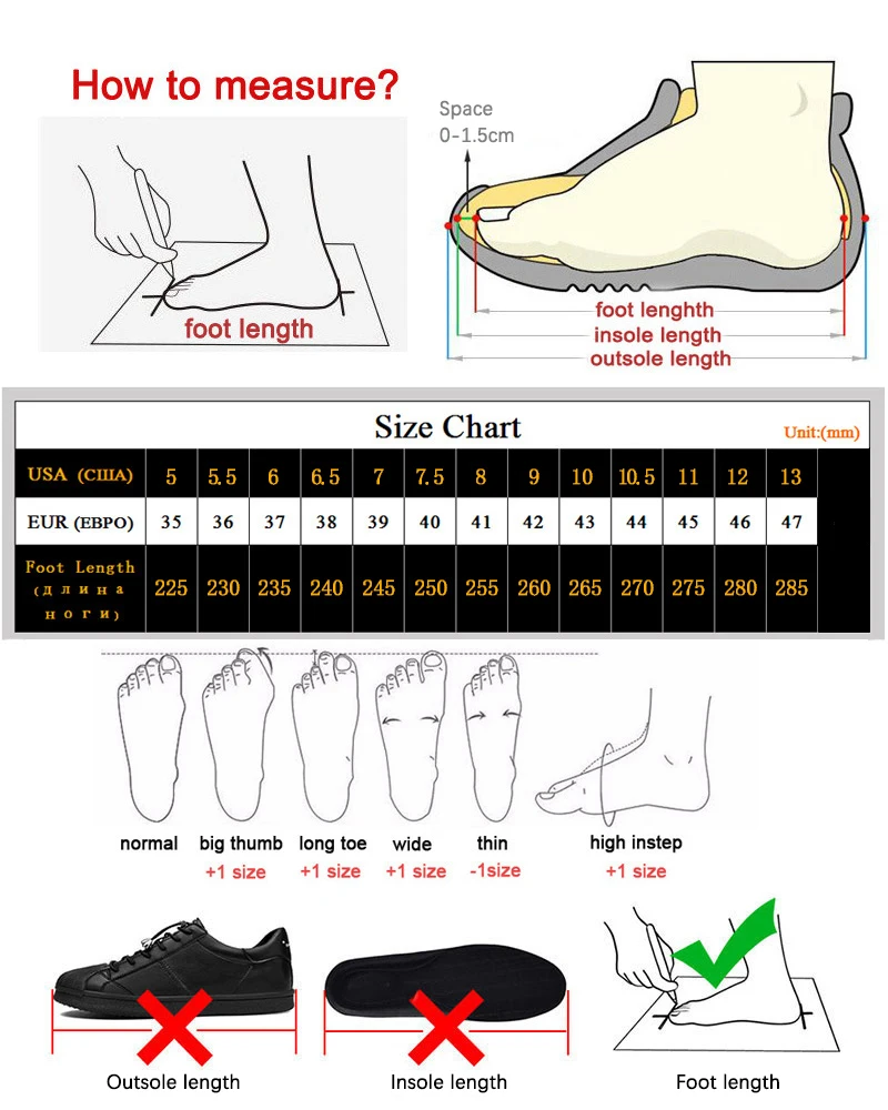 2. Размер США или европейский размер может отличаться от страны, в которой вы находитесь. Пожалуйста, выберите размер в соответствии с длиной стопы. Если у вас толстая или широкая стопа, мы рекомендуем вам выбрать больший размер. Если вы не уверены, свяжитесь с нами. Допускается погрешность в 0,5 см из-за ручного измерения.