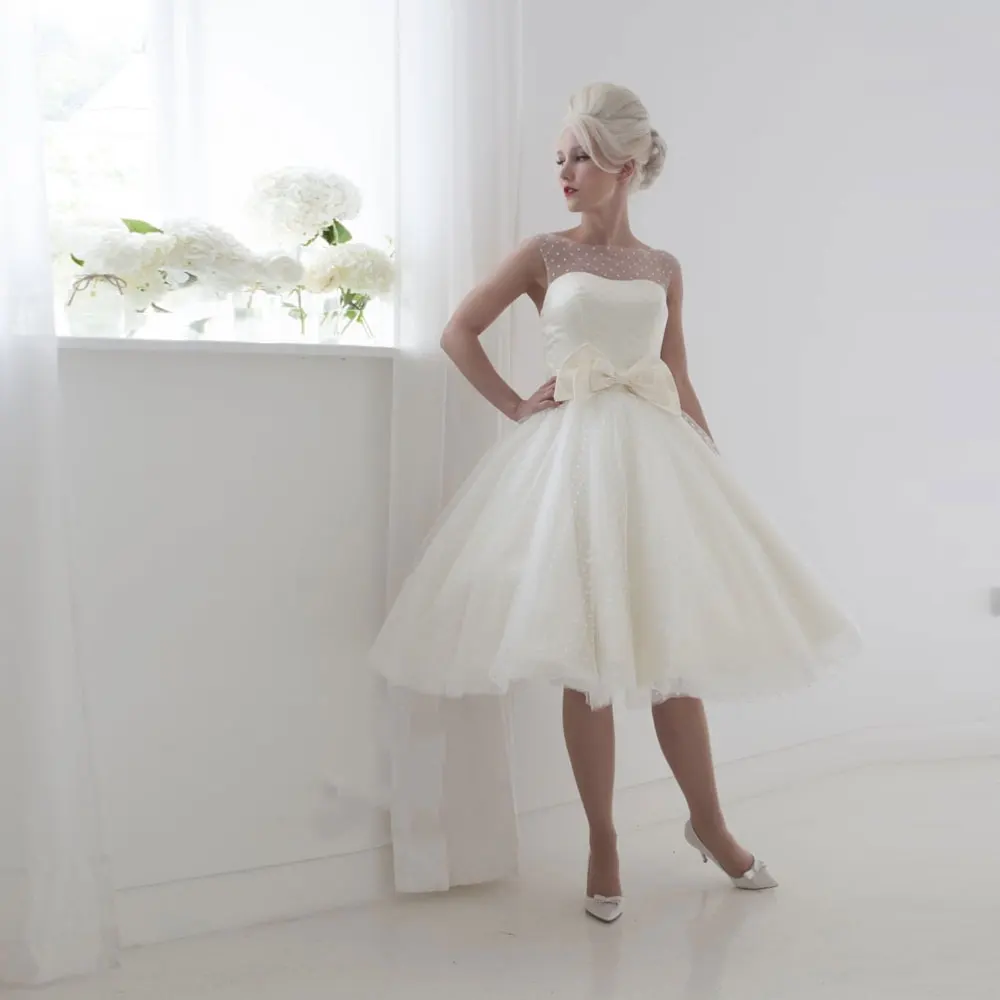 Короткое свадебное платье с пышными рукавами и воротником в виде се...