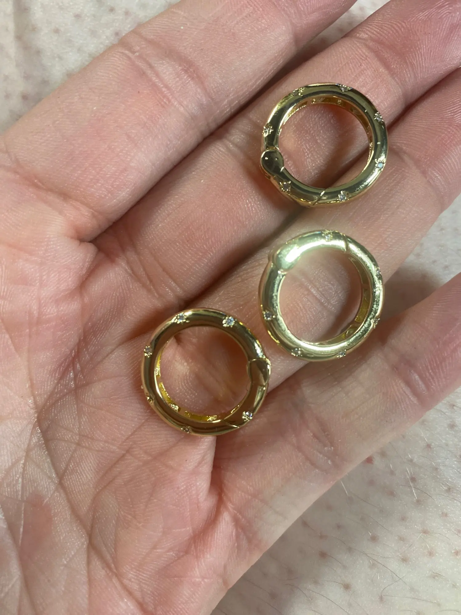 Они легкие, которые идеально подходят для ювелирных изделий. Одна небольшая информация: если вы отпустите застежку, она автоматически не закроется, как настоящий карабин. Вам нужно кликнуть его на место. Легко соединяется между собой, но это хорошая вещь. Я думаю, что цена за эти товары была высокой. Если бы я мог купить меньший, изящный вариант, и я мог бы получить 14 за ту же цену, что и 7, которую я купил, я бы купил их оптом