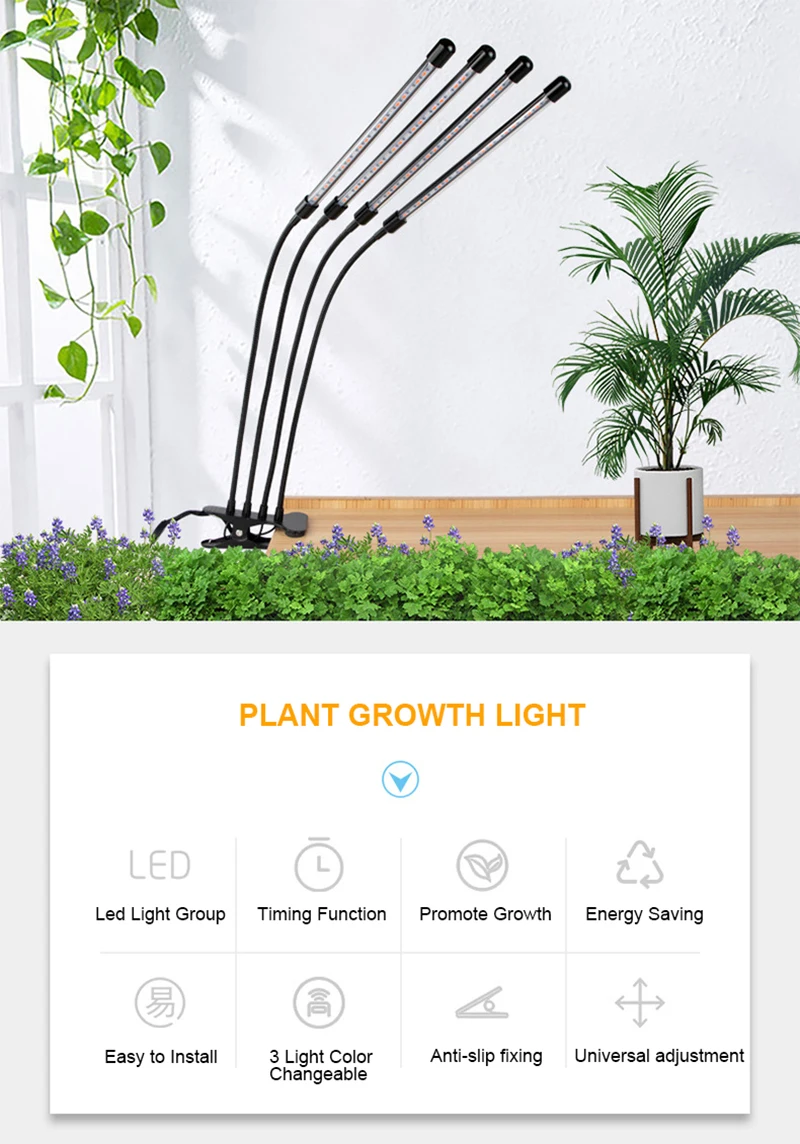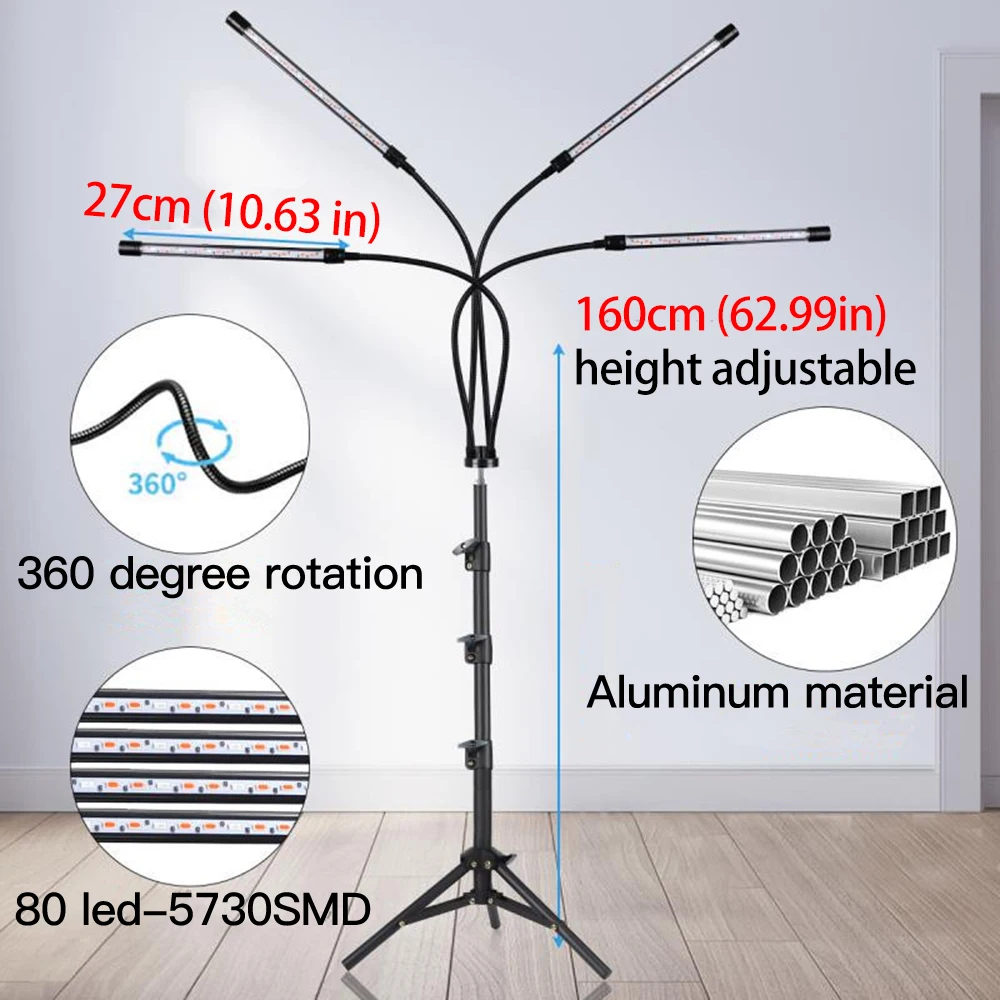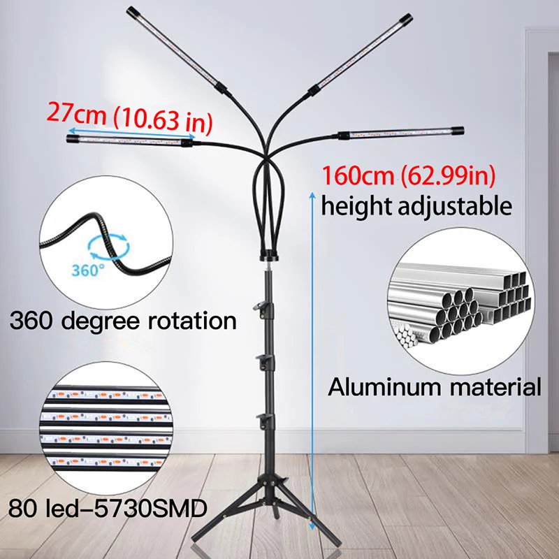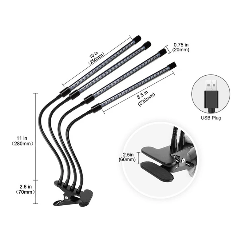 Вид продукции: 1 / 2 / 3 / 4 головки растут светильникНоминальная мощность: 10 / 20 Вт, 30 Вт, 40 ВтСветодиодный: 20 светодиодный/40 светодиодный/60 Светодиодный/80 светодиодныйДля 4 головок: 80 шт. (52Red & 28Blue)Материал: алюминий и ПВХРазъем: USBВходное напряжение: 5 ВВходной ток: 3AДлина волны: Красный: 645-655 нм/синий: 460-465нмРабочая температура:-20 ° ~ 40 °Срок службы: 50000 часовДиапазон освещения: 2-3 квадратных метраДостаточном расстоянии от лампы для растений: 0,98-3.98ft (30-120 см)Функция:Плавное затемнение + управление временем + 3 светильник изменяемый цветРазмер: как показано на изображении ниже
