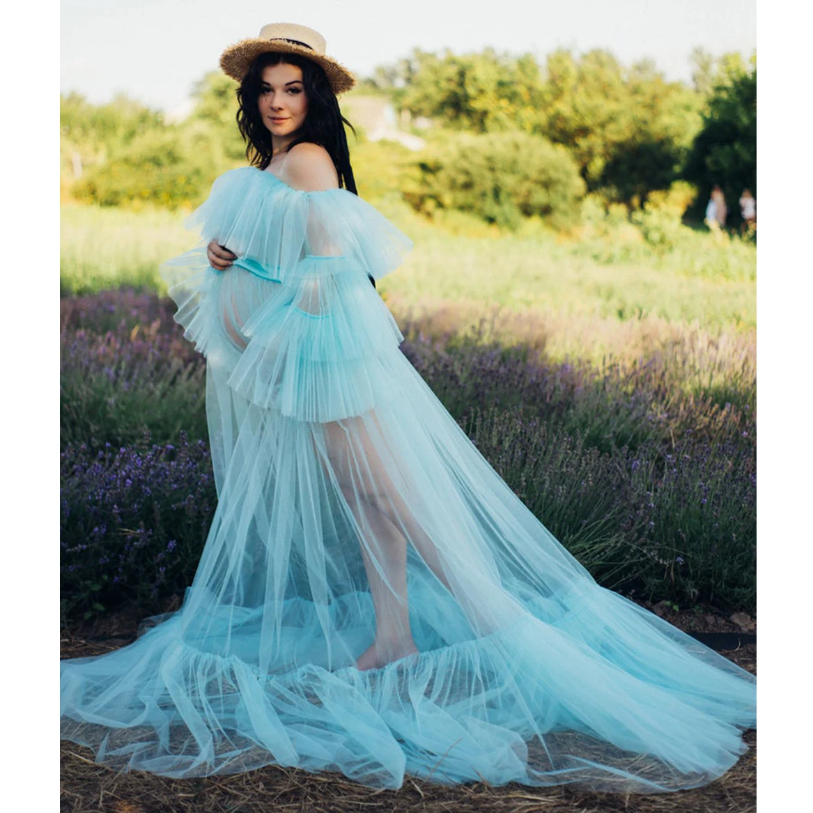 Фотосессия Иллюзия халат для беременных женщин платье для фотографии с открытыми плечами Небесно-Голубой тюль платья для беременных женщин халаты