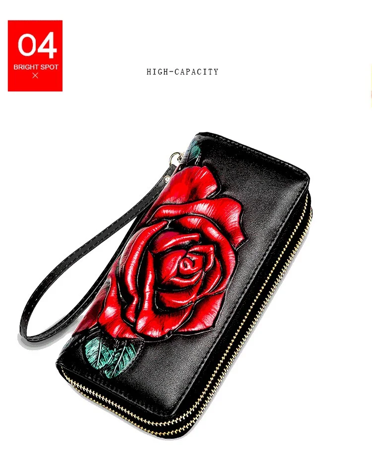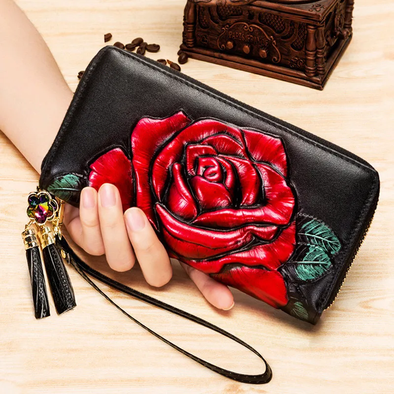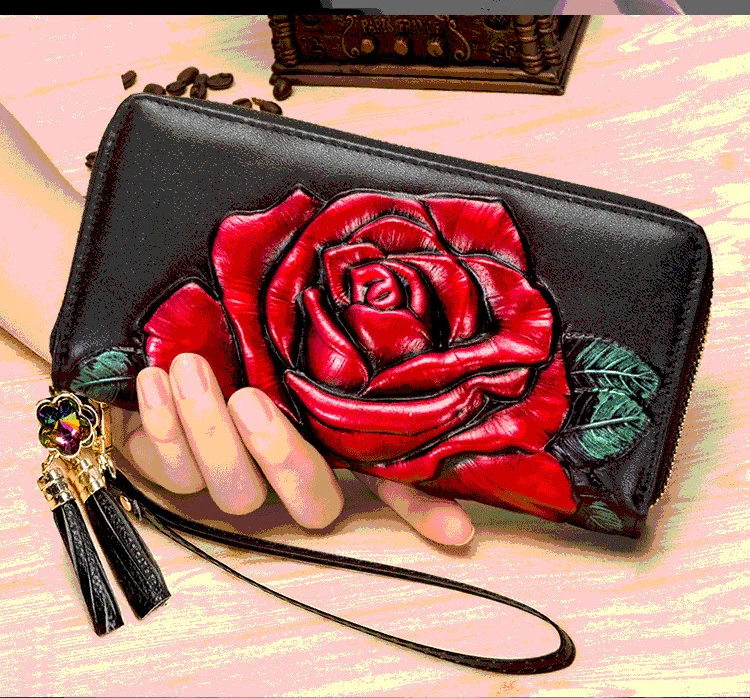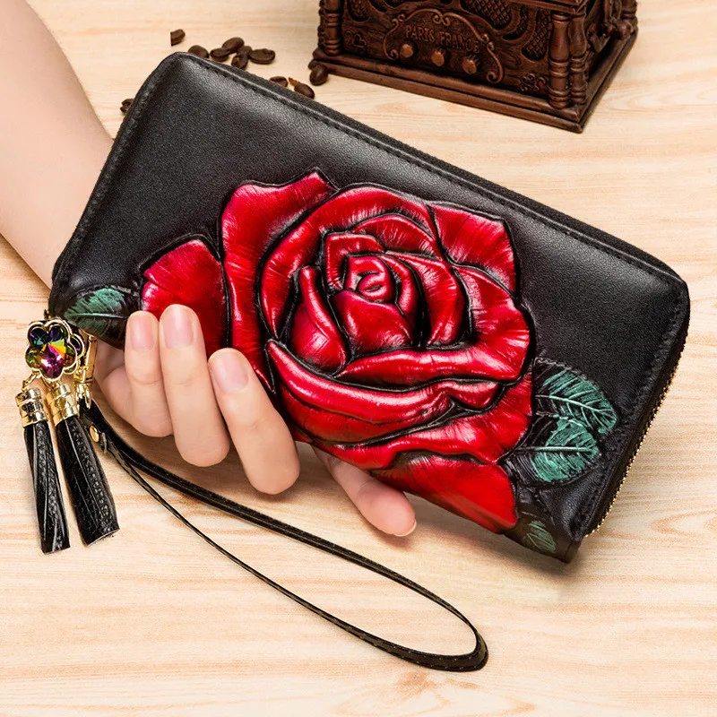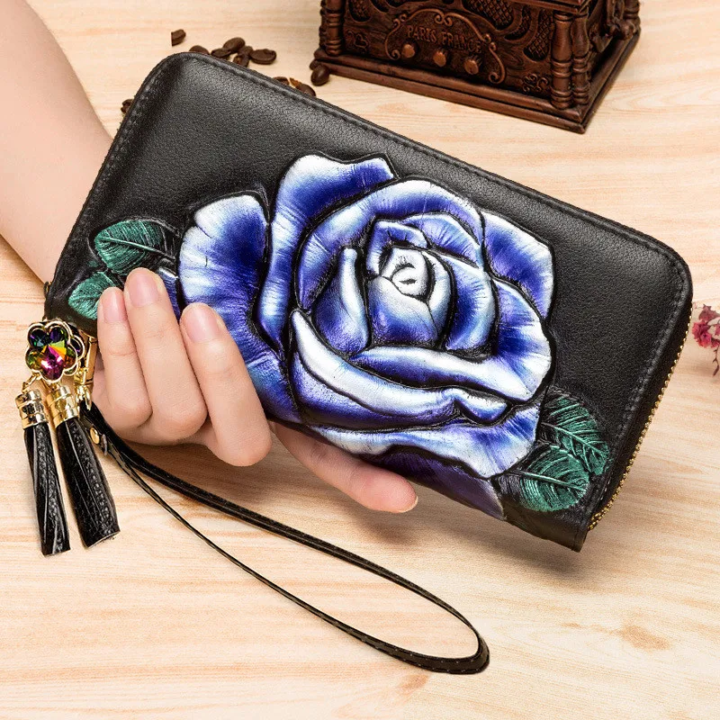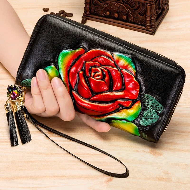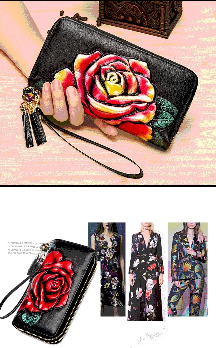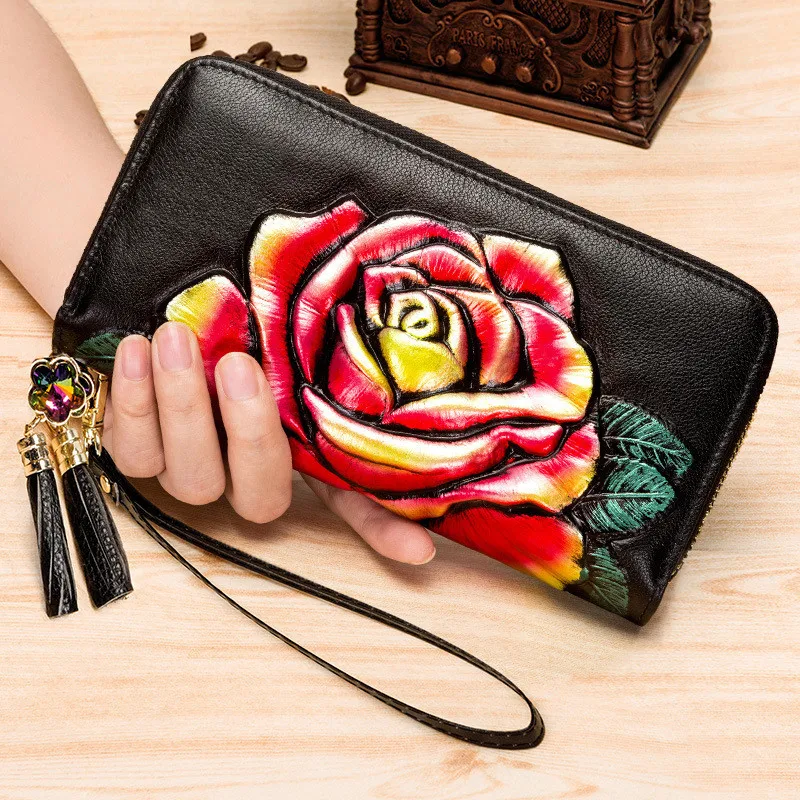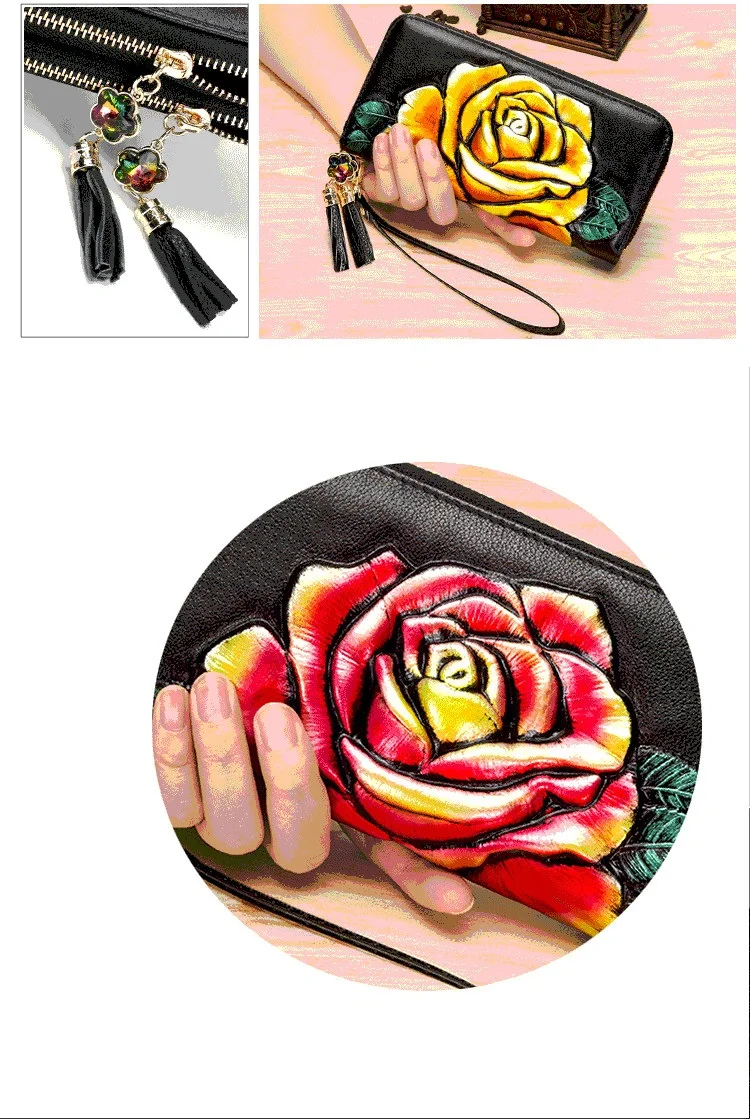 Женский Длинный кошелек из натуральной кожи с цветочным рисунком, женский бумажник, клатч с двойной молнией, кошелек для сотового телефона и кредитницы, 2022