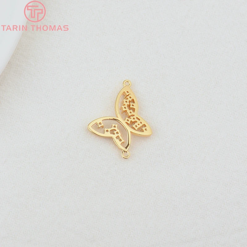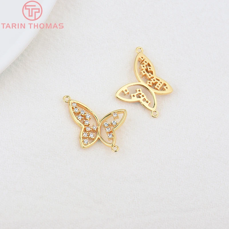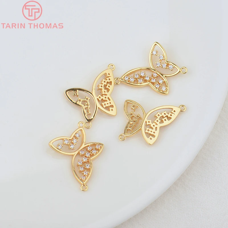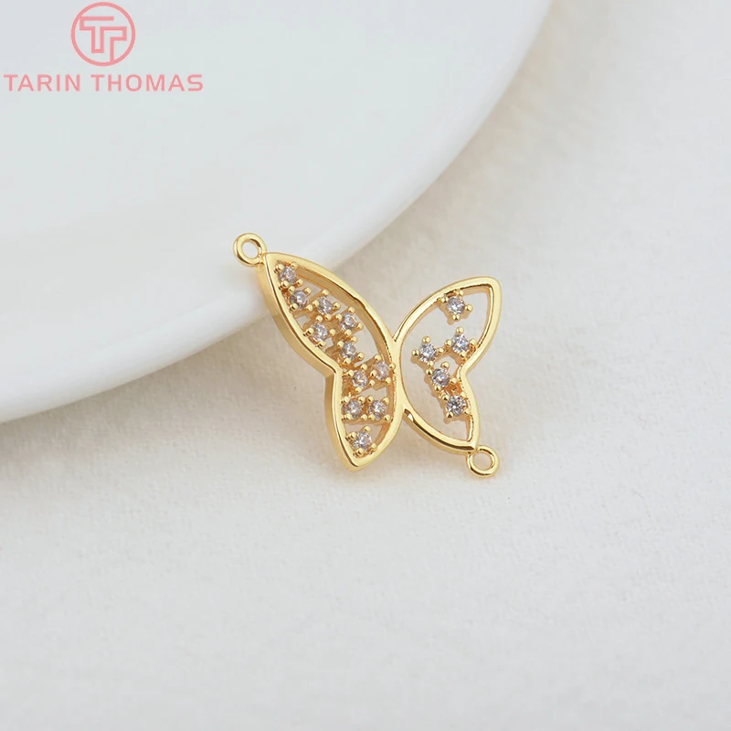 Латунные подвески в виде бабочки с цирконом, 4 шт., 14 х18 мм, 24 карата