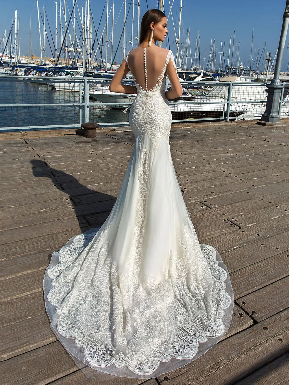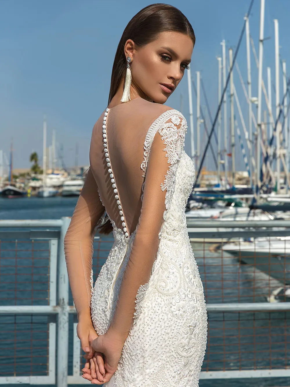 Длинное свадебное платье-русалка, с пуговицами, круглым вырезом, длинными рукавами, с кристаллами бисерная аппликация, 2021