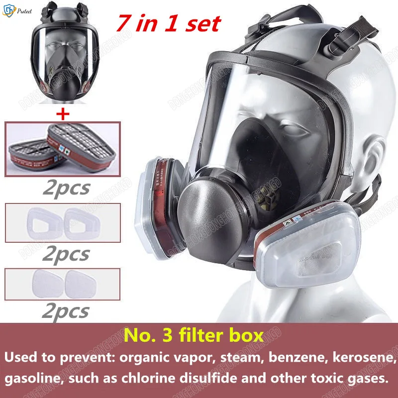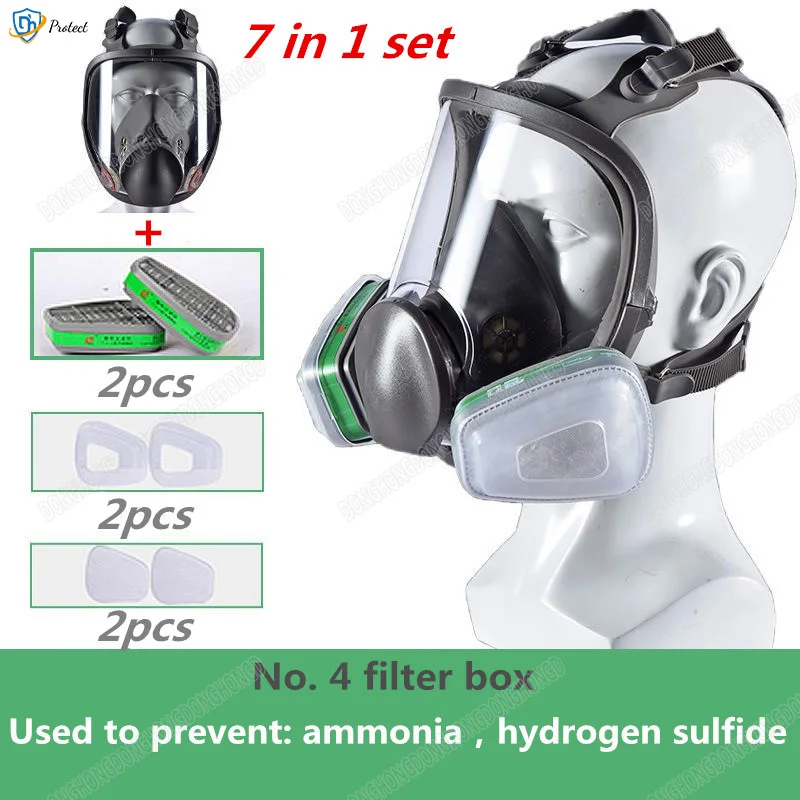 Кислотный газ, набор из 7 предметов: 1 маска, 2 No. 7 фильтровальных коробок, 2 фильтра из хлопка, 2 фильтра Функция продукта: кислотный газ и пар, фосген, хлорид водорода, оксиды азота, двуокись серы, диоксид хлора, сероводород, фосфоросодержащие пестициды.
