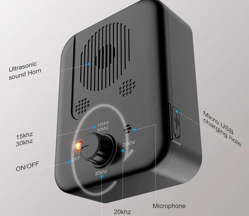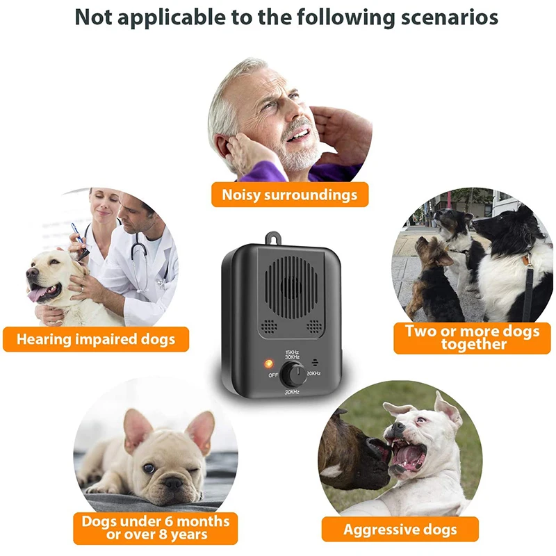 100% безопасен для людей и подходит для собак:Ультразвук не вызовет никаких помех или вреда для человека, потому что человек не может слушать эти Частотные полосы, но Собаки будут чувствительны к этим ультразвукам. Различные собаки могут быть разумны для ультразвука различных частотных полос. Поверните ручку для проверки различных диапазонов частот для получения наилучших результатов.