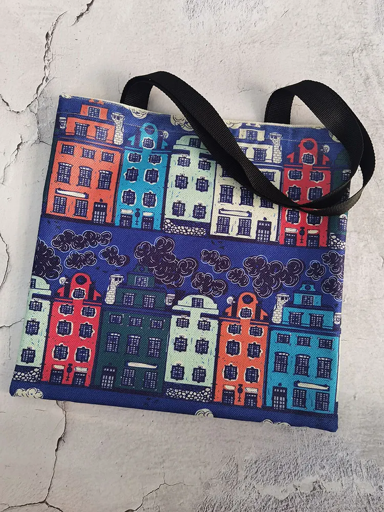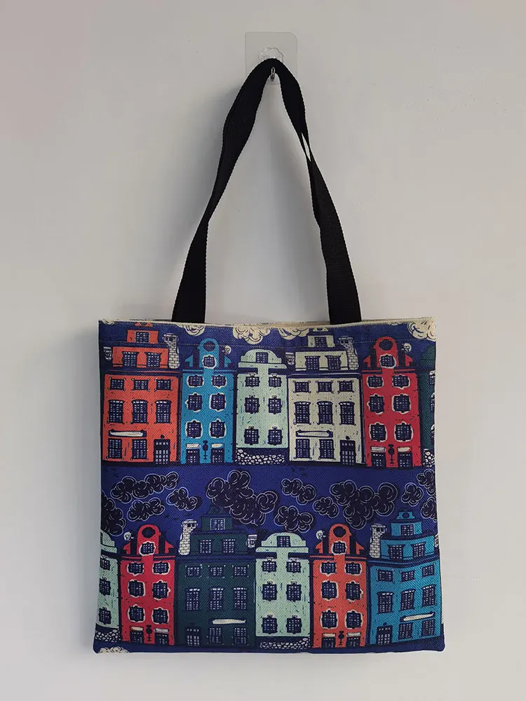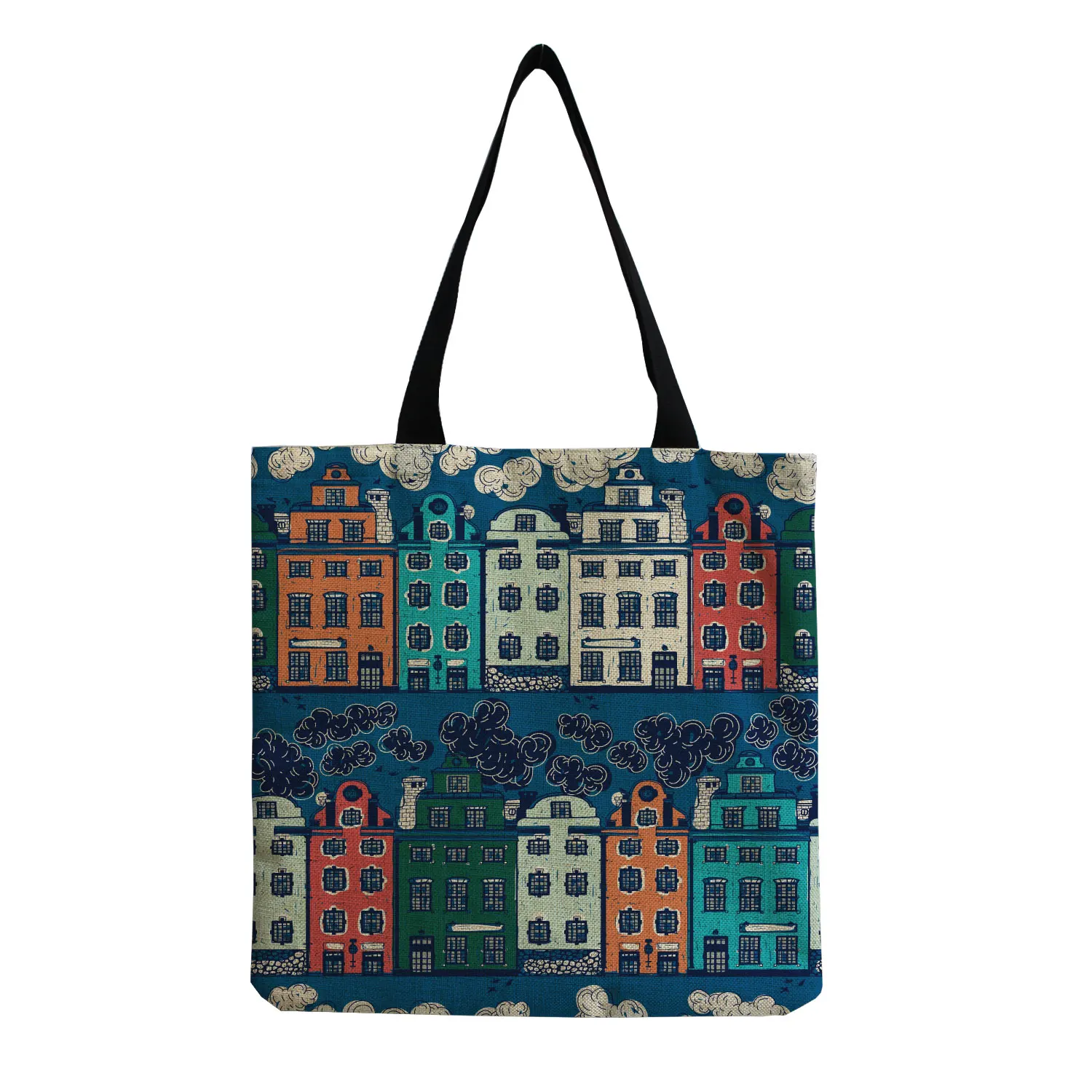 Вместительная практичная Повседневная сумка для покупок, Льняная сумка с мультяшным изображением зданий и принтом, личность для художественного творчества сумки-шопперы для женщин