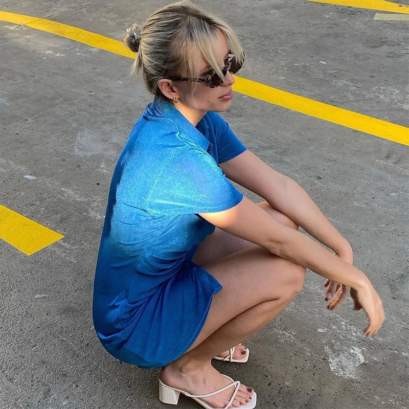 Женское мини-платье WannaThis, с коротким рукавом, пуговицами и отложным воротником, сексуальные модные повседневные летние платья, обтягивающие эластичные синие однотонные платья