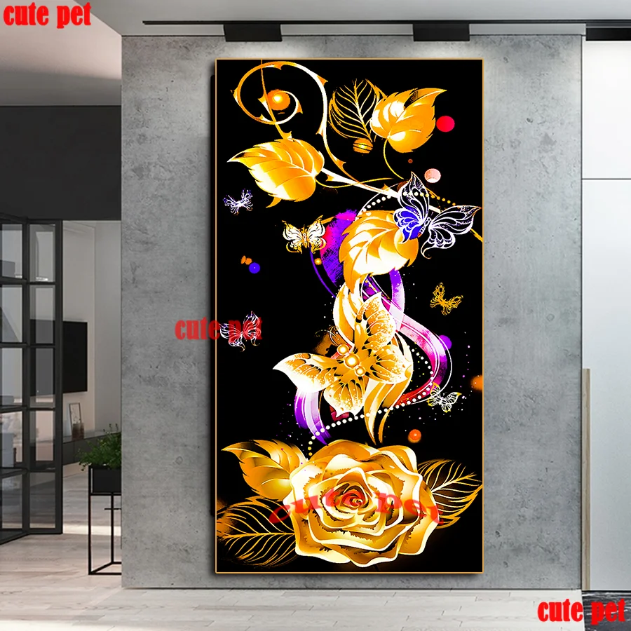 5d Вышивка крестиком, алмазная живопись, Золотая Роза, полная квадратная круглая Алмазная вышивка, мозаика, Бабочка, Настенный декор, значок наклейки большой