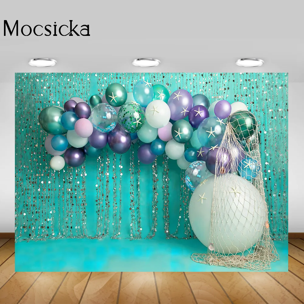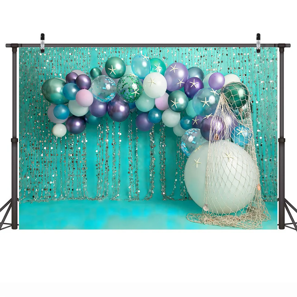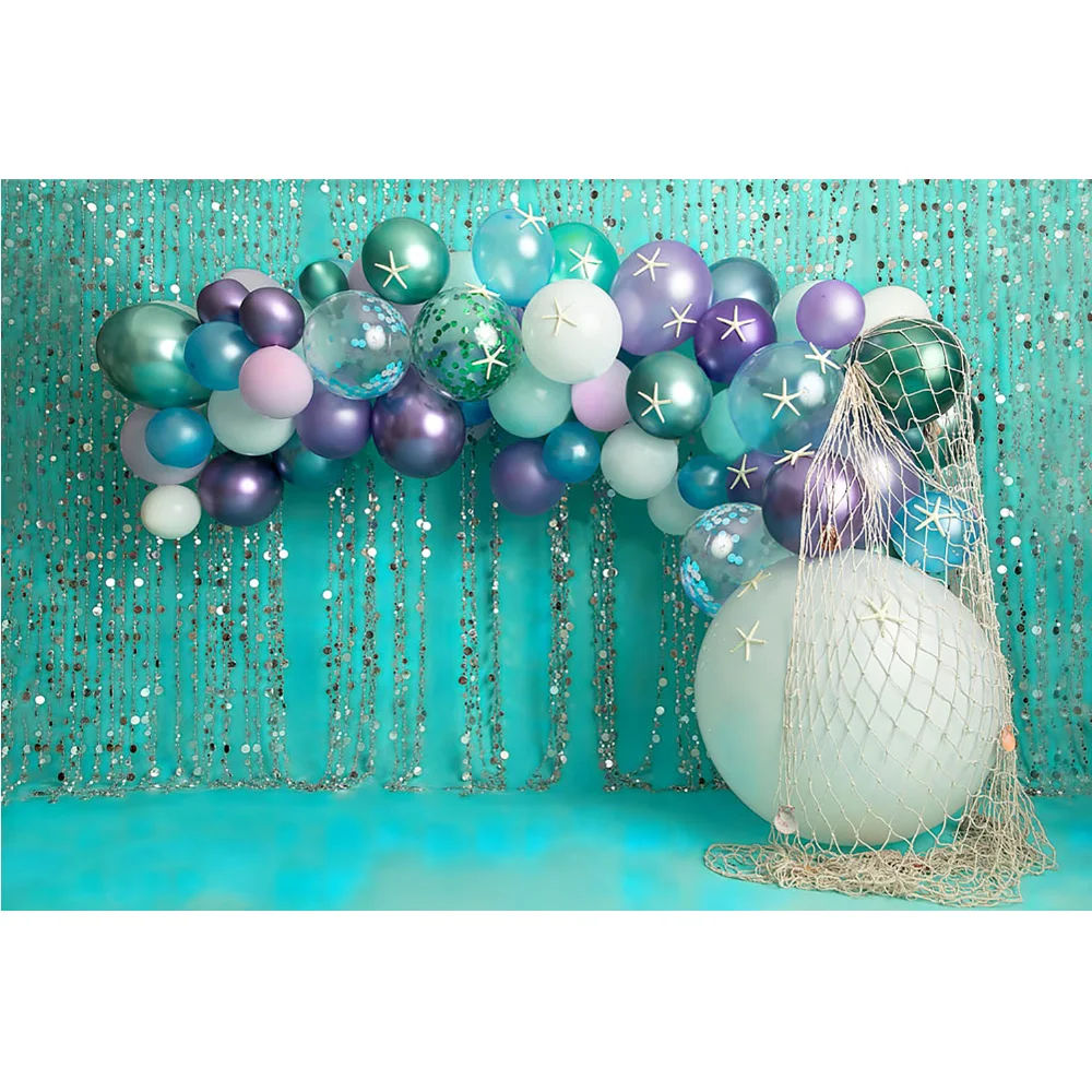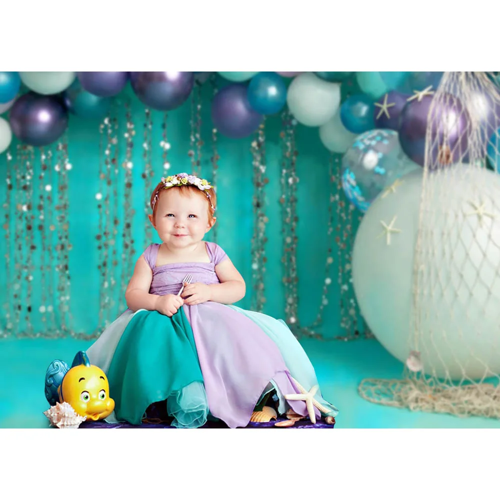 Фон для фотосъемки новорожденных с изображением маленькой Русалочки, блестящих серебристых и синих морских тортов на день рождения