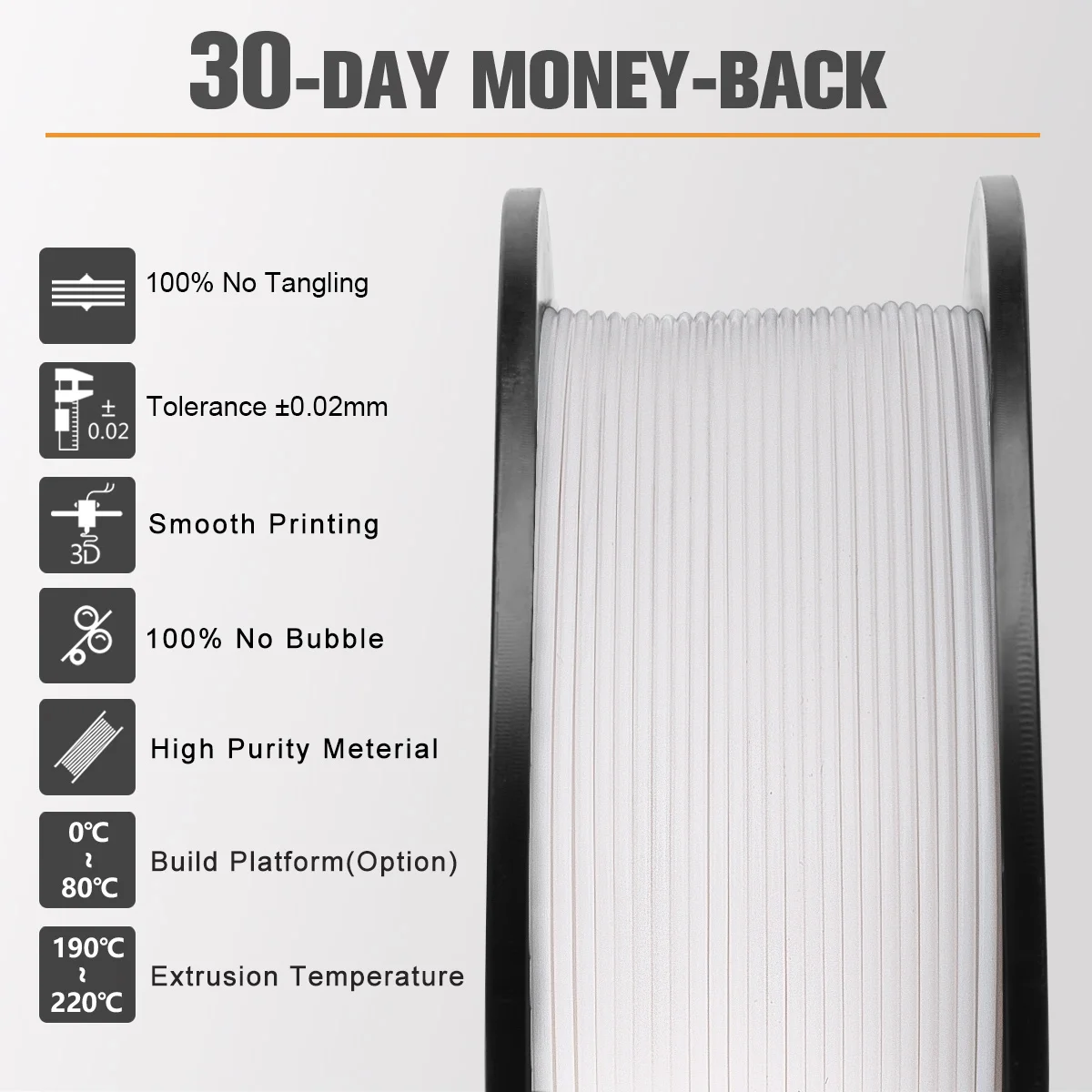 Диаметр: 1,75 ± 0,02 ммТемпература печати: 200-230 ℃Температура платформы: альтернативы 60-80 ℃Скорость печати: 50-100 мм/секция.Вес нетто: 1 кг с катушкой,Вес брутто: 1,3 кгДлина: 1,75 мм (1 кг) = 330 м