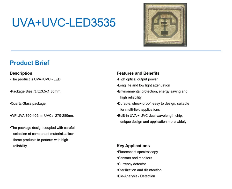 Для того, чтобы уменьшить ваше время и экономические потери, пожалуйста, введите в строке поиска на проверяйте светодиодный введение UVC светодиодный размерную сетку США самостоятельно.Настоящий светодиодный UVC может излучать Только слабый светильник. UVC обеспечивает эффект стерилизации через лучистую энергию, а не прочность светильник, чтобы определить UVC!Если вам нужны более подробные отчеты об испытаниях и таблицы данных, пожалуйста, свяжитесь с нами, и я пришлю вам электронное письмо.Если вам нужно большое количество заказов, пожалуйста, свяжитесь с нами, чтобы узнать цену оптовых покупок.