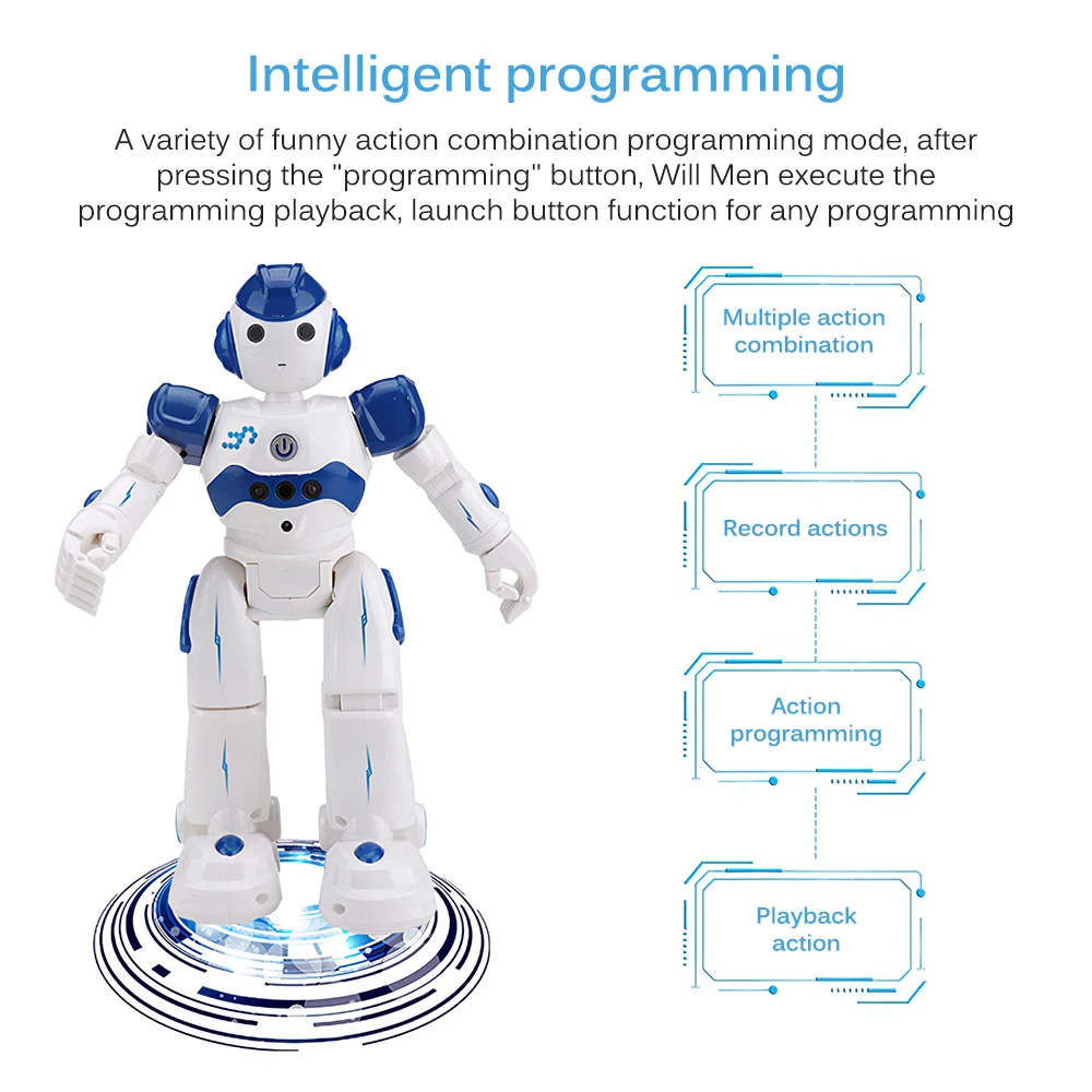 Эта игрушка программируется, вы можете комбинировать несколько действий, и робот будет воспроизводить один за другим в соответствии с запрограммированными настройками.