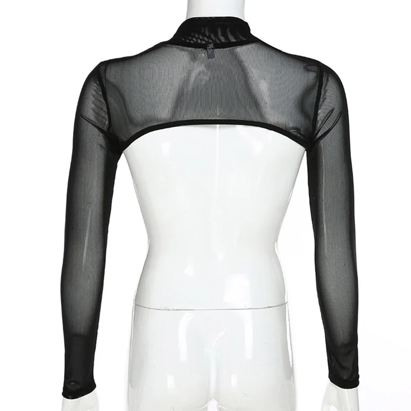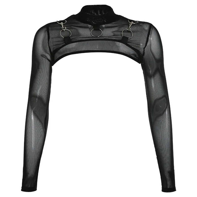 Женская футболка kayojuta, Сексуальная футболка в стиле хип-хоп, Готическая Женская микро короткая кружевная прозрачная сетчатая Водолазка с длинным рукавом и металлической цепочкой, Популярные топы