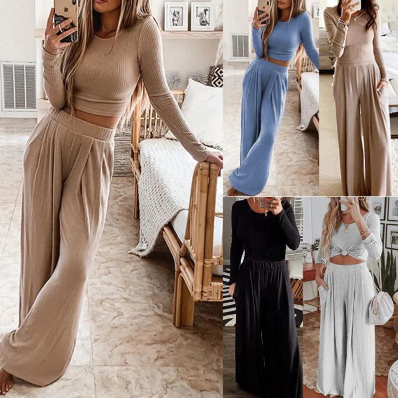 Спортивный костюм женский трикотажный в рубчик, повседневный комплект из 2 предметов, Топ с длинным рукавом и длинные брюки, элегантный однотонный костюм для отдыха с круглым вырезом