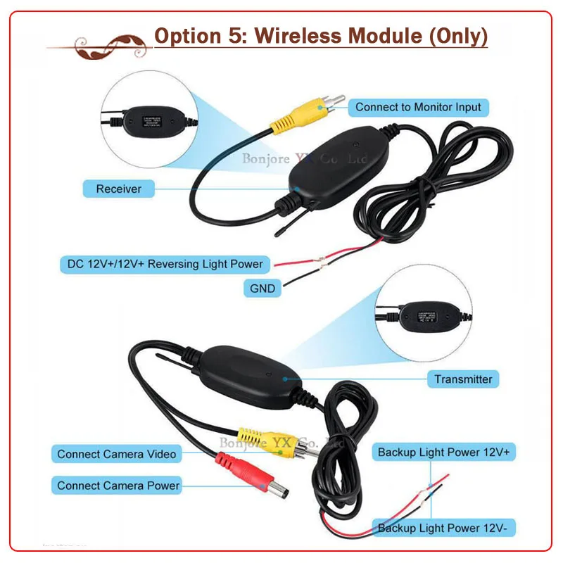 Подключите беспроводной модуль (приемник) к автомобильному аккумулятору или прикуривателю, чтобы получить питание-красный провод для положительного и черного провода для отрицательного