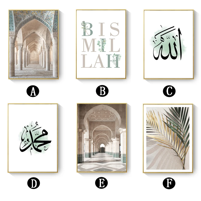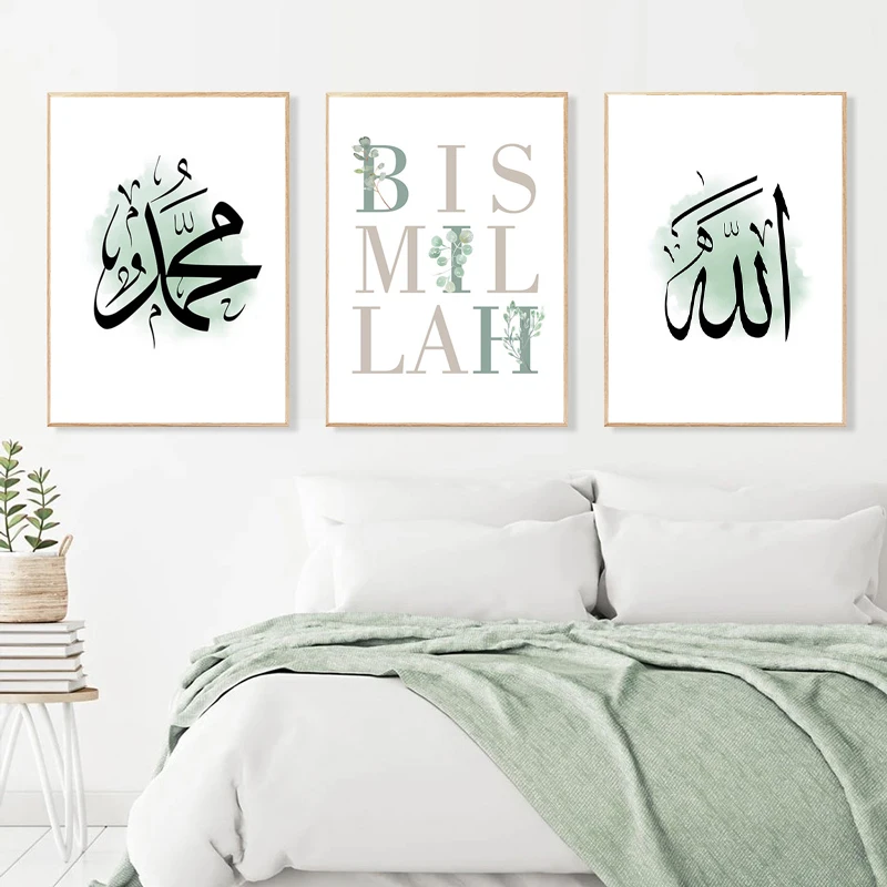 Рисунок на холсте с зелеными листьями мусульманской бисмиллы, Современная Марокканская архвальная Настенная картина, Постер для гостиной, домашний декор