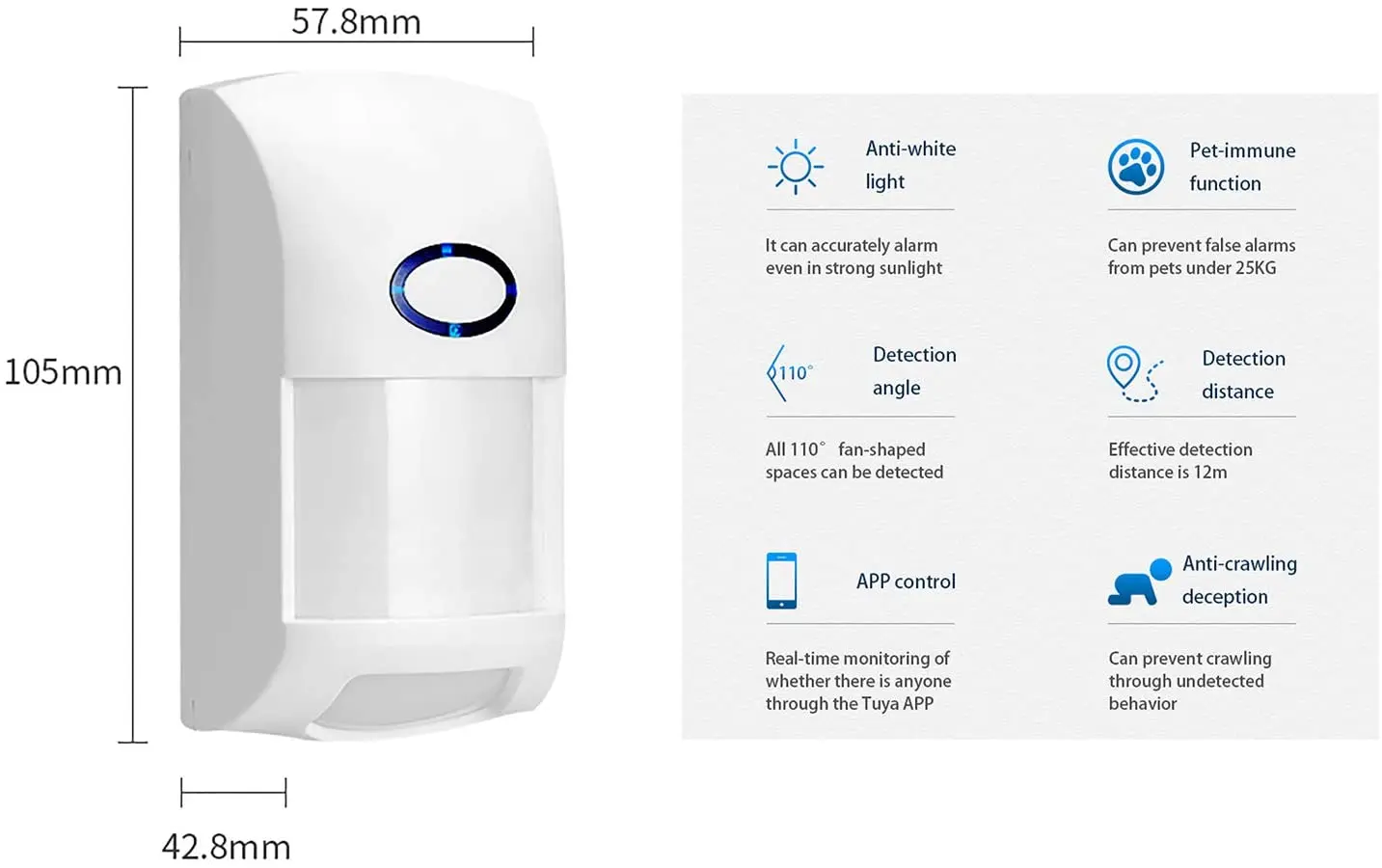 【Работа автономная, простая в использовании 】wifi pir датчик движения, дистанционное управление с помощью приложения. Используйте приложение Tuya бесплатно, его можно использовать d независимо от подключения к WIFI без подключения к главному блоку сигнализации. Минималистичный экран, простота в эксплуатации, отслеживание в режиме реального времени, есть ли кто-то через приложение Tuya, когда обнаруживается движение, оповещение будет нажмите на ваш телефон, ясно с первого взгляда. Может использоваться с Alexa, Google Home и Siri. 【Широкий диапазон обнаружения 】 senckit smart wifi датчик движения, Применяя технологию обнаружения Френеля, расстояние обнаружения 12 м, все пространства в форме вентилятора 110 ° эффективный угол обнаружения, предотвращение Ползания при необнаруженном виде. 【Точный alarm】wifi датчики движения с отражающей технологией обнаружения зеркала, он может точно сигнализировать даже в сильный солнечный светильник (анти-белый светильник 7000Lux), осуществлять мониторинг в реальном времени днем или ночью; предотвращает ложные сигналы тревоги или занижение отчетов от Домашние животные до 25 кг. Полная автономная система сигнализации на основе датчика движения для сарая, кухни, комнаты, лодки, гаражи и т. д. 【защита от низкого заряда батареи 】использование технологии интеллектуального распознавания, использование 2шт батареек AAA, сверхдолгое время работы в режиме ожидания 30ua может работать в течение шести месяцев без замены Аккумулятор. Когда индикатор низкого заряда батареи загорается зеленым цветом, телефон получает удаленное напоминание. 【Профессиональная Беззаботная гарантия 】-датчик движения SENCKIT является второй защитой для домашней безопасности, обеспечивает вам лучшую безопасность. Вы будете наслаждаться нашим профессиональным возвратом и гарантией обмена со дня получения домашней охранной сигнализации. Мы уверены, что вы обнаружите, что это важно для вашего дома