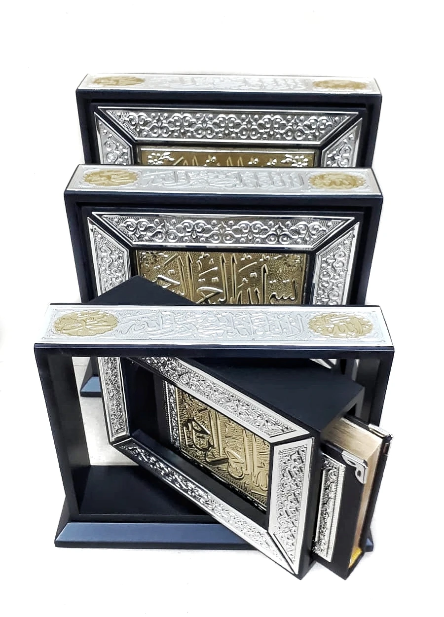 Материал корпуса: 925 пробы Посеребренная никелевая пластина на деревеТип коробки: горизонтальный, с узоромКоран: 925 пробы покрытая серебром никелевая пластина из искусственной кожиПечать: Министерство по религиозным вопросам Турции и Египта аль-Азхар из герметичнойЦвет печати: 6 цветовКоличество страниц: 613 страниц (604 страницы текста Корана, другие индексы и т. Д.)Позолота: в наличииСкобы: металлПосеребренная коробка Размеры: 19x25x6 см-21x28x6 - 24x30 см x 6 смПосеребренная специальная твердая обложка Koran Размеры: 12x17 см-14x20 см-16x24 см