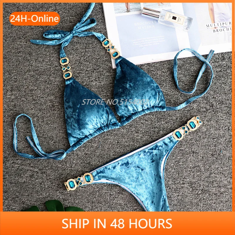 Сексуальное бархатное бикини с кристаллами и бриллиантами 2021, Женский бандажный купальник, Женский раздельный купальный костюм в бразильском стиле с лямкой на шее