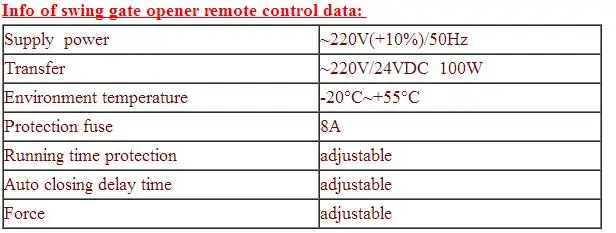 1. Панель управления может подключать мигающий светильник и фотоэлемент, а также резервную батарею, солнечную систему и клавиатуру и так далее.2. Управление одним или dluble-leaf двигателем является необязательным.3. Можно регулировать время открытия и закрытия двери.4.24VDC резервный аккумулятор может быть вход. (Это использовать большой контроллер, наш стандартный контроллер маленький размер.)5. Высокая скорость работы может регулироваться.6. Установить дополнительный пульт дистанционного управления легко, до 30 шт. пульт дистанционного управления.7. Что касается дистанционного управления: кнопка 1 открывается, останавливается, закрывает один ворот, кнопка 2 предназначена для открытия, остановки, закрытия двух ворот.