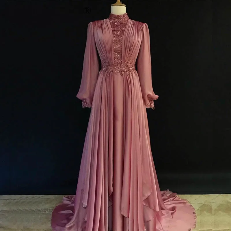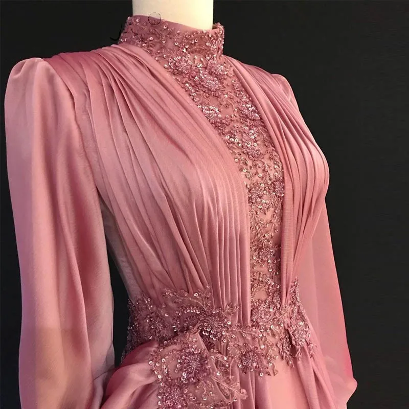 Женские вечерние платья, шифоновые плиссированные платья с бисером, с высоким воротом, на заказ, в мусульманском стиле с длинным рукавом