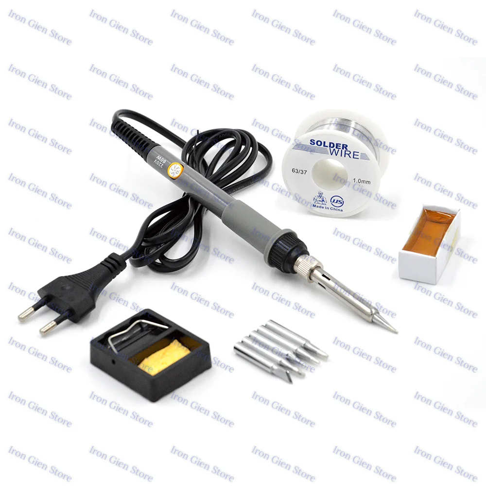 Электрический паяльник 220 в 60 Вт с европейской вилкой, набор инструментов для сварки с регулируемой температурой, с паяльной проволокой, канифоль, железная подставка, 5 наконечников для припоя