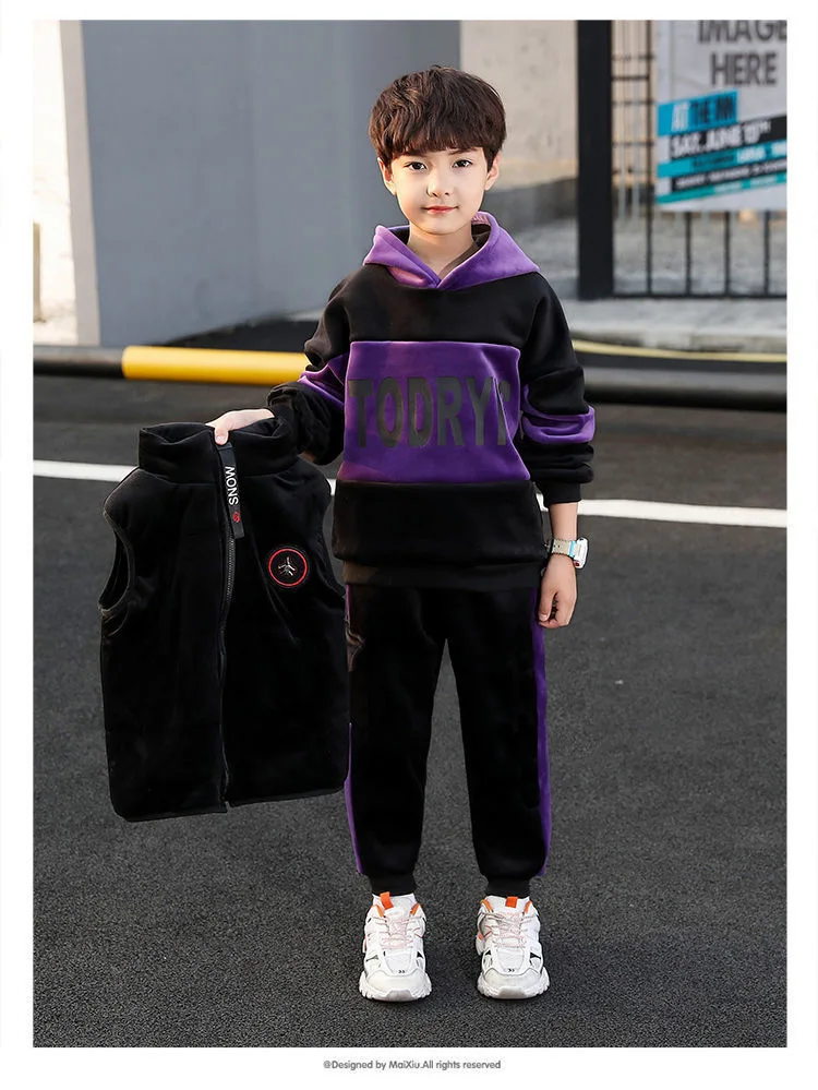 Детская одежда, костюм для мальчиков, новинка 2021, весенне-осенняя одежда, Детский Комплект из трех предметов с вельветовой подкладкой, жилет + толстовка + штаны, От 4 до 14 лет