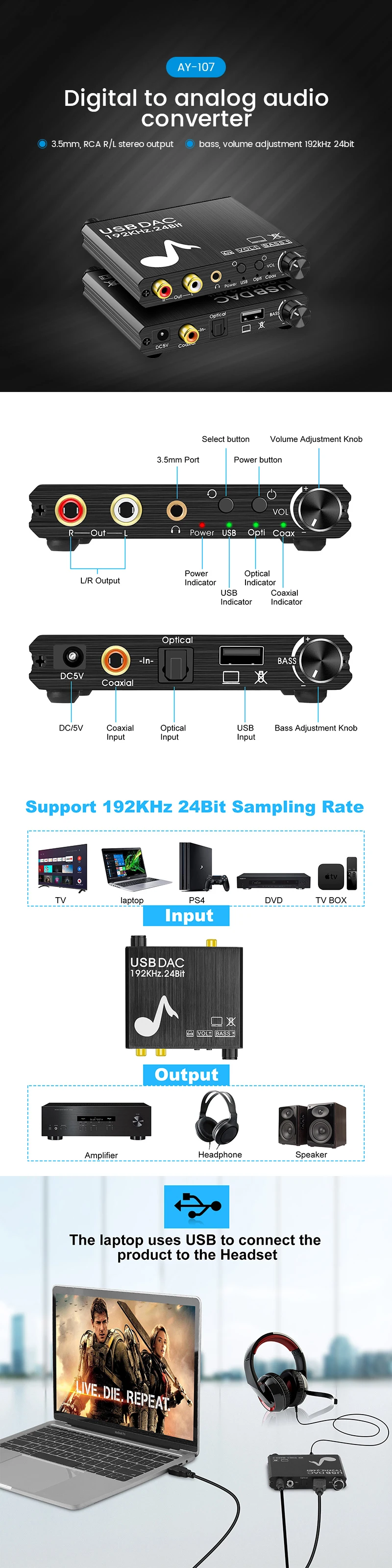 Введение:Этот продукт разработан специально для обработки профессионального аудио сигнала, вы можете легко преобразовать цифровой звуковой сигнал ввода коаксиальный или Toslink интерфейс в аналоговый стерео аудио сигнал RCA Интерфейс и 3,5 мм для наушников.Встроенный чип профессионального аудио усилителя и регулятор регулировки громкости могут непосредственно управлять наушниками и регулировать громкость.Функция регулировки басов продукта может обеспечить мощные стерео, тяжелые басы и создать идеальную среду, отличную от звукового поля. Полученный эффект очень очевиден, что делает вас откровенными в мире басов.Особенности:● Одно Оптическое волокно и один коаксиальный входной интерфейс. Подключение к DVD, hd-плееру и другим устройствам● Один вход USB, подключение к компьютерам.● Один выходной интерфейс RCA, подключен к системе усилителя мощности● Один канал 3,5 мм аудиовыход интерфейс сервера сигнализации), подключить к наушникам.● Устранение шума, когда нет входного сигнала, и автоматическое отключение звука при входном сигнале.● Поддержка частоты дискретизации 192 кГц 24 бит.● Поддержка регулировки громкости● Поддержка регулировки басов● Металлический корпус, защита от помехХарактеристики:Модель
