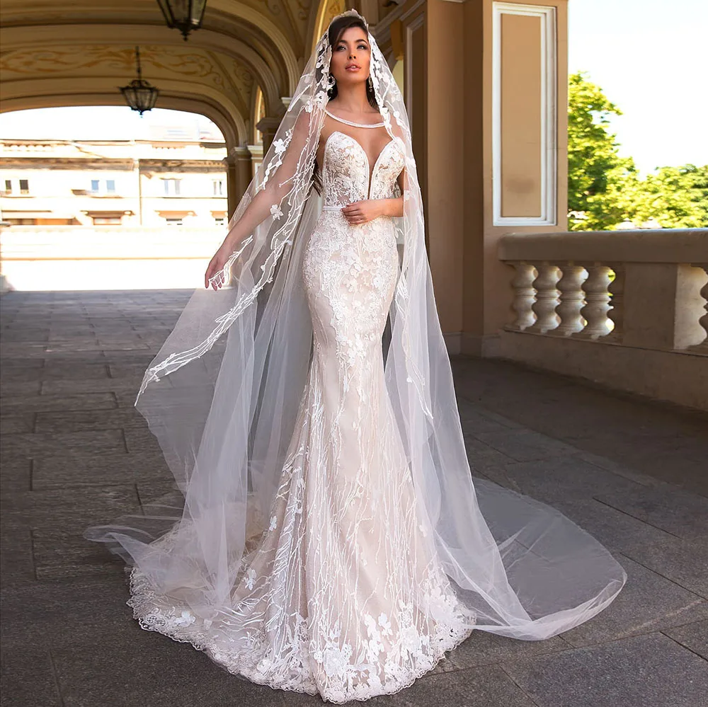 Женское свадебное платье с юбкой-годе, белое блестящее платье до пола с круглым вырезом, открытыми плечами и аппликацией, 2021