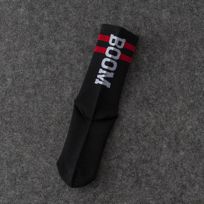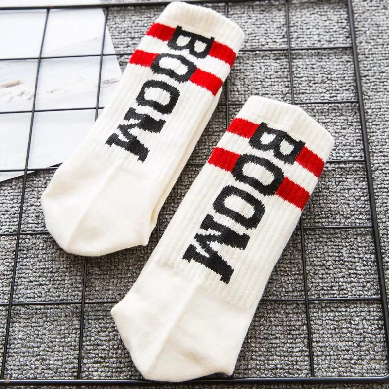 1 пара абсолютно новые модные хлопковые футболки с надписью BOOM высокие женские носки скейтборд вспыш и чудо-уличные Happy длинное женское пальто девочек платье по доступной цене