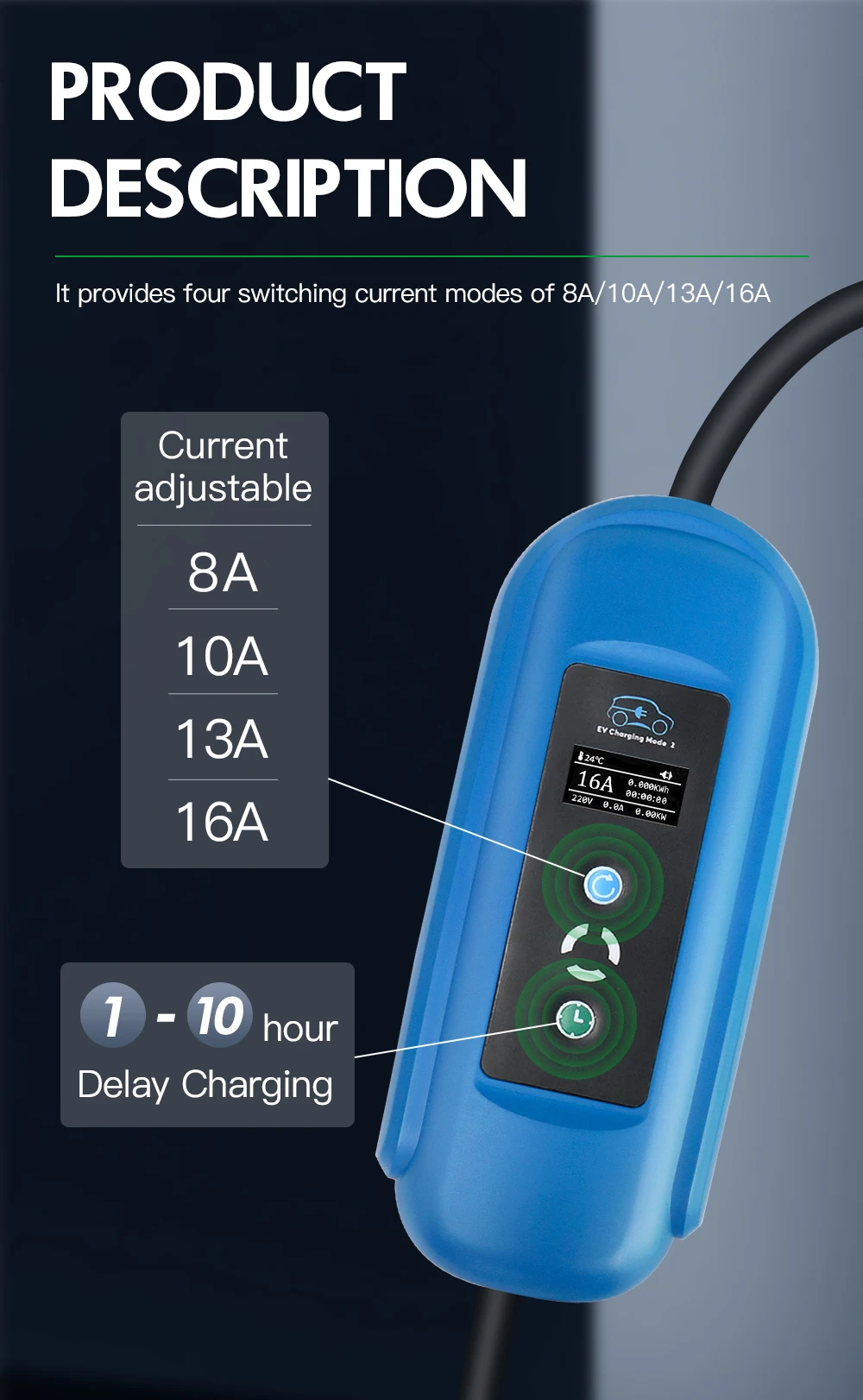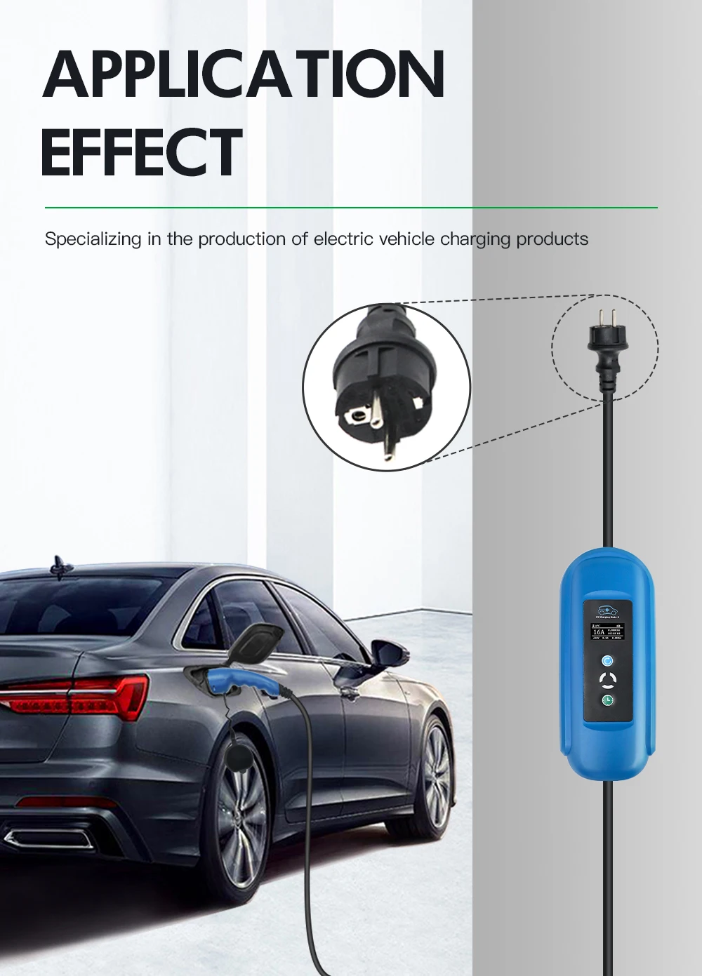 1. Подключите источник питания;Подключите вилку к стене.2. Как начать зарядкуПосле подключения источника питания, загрузочный экранПоказывает в течение нескольких секунд, затем превращается вОбычный рабочий экран;По умолчанию используется ток 8А или последнийТок.3. Как переключить токОтключите автомобиль;Нажмите синюю кнопку один раз для переключения;Вставьте в машину.4. Готово.